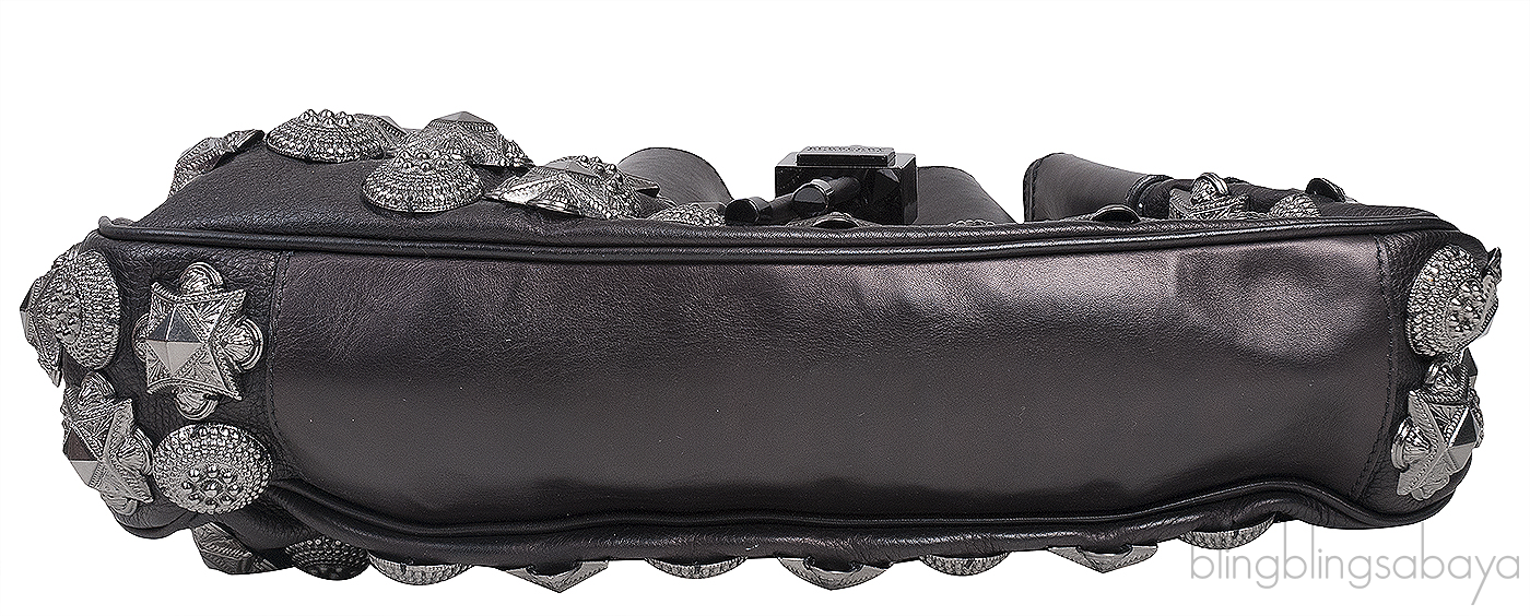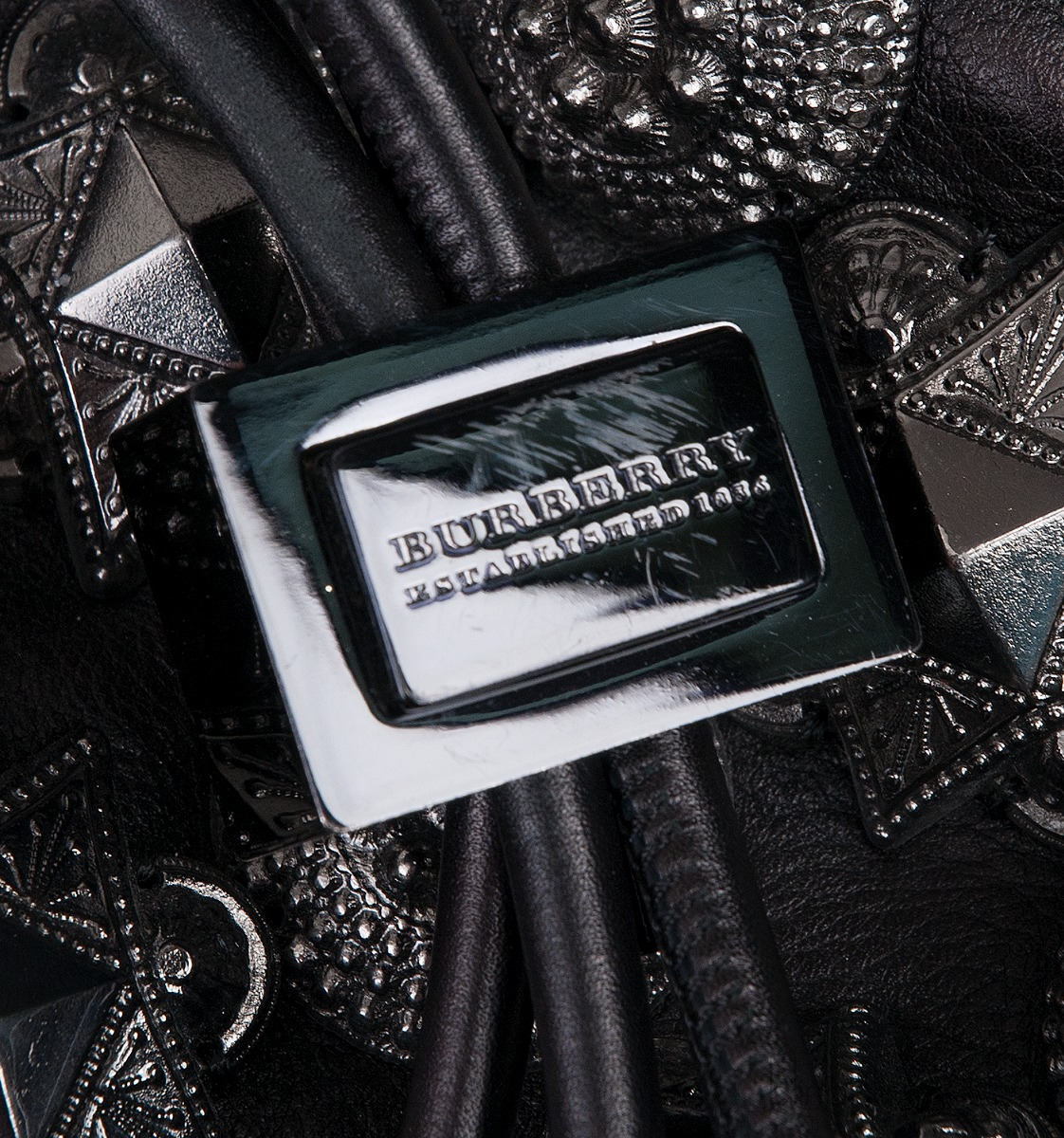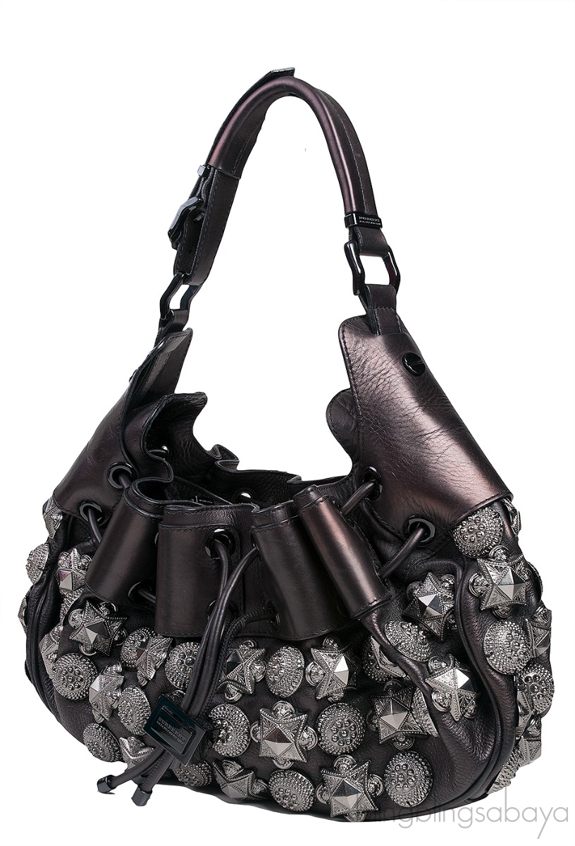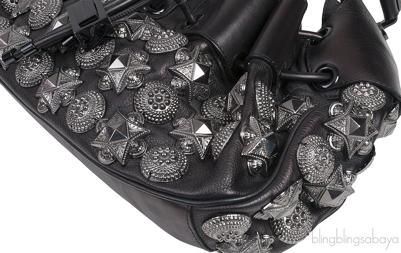 This Prorsum Leather Mason Warrior Bag from Burberry is crafted from black textured with smooth leather trim accented with black and gun metal hardware. This bag features a drawstring fastening at front with metal push lock closure, adjustable flat single leather strap and accented with gunmetal studs at front through the back.