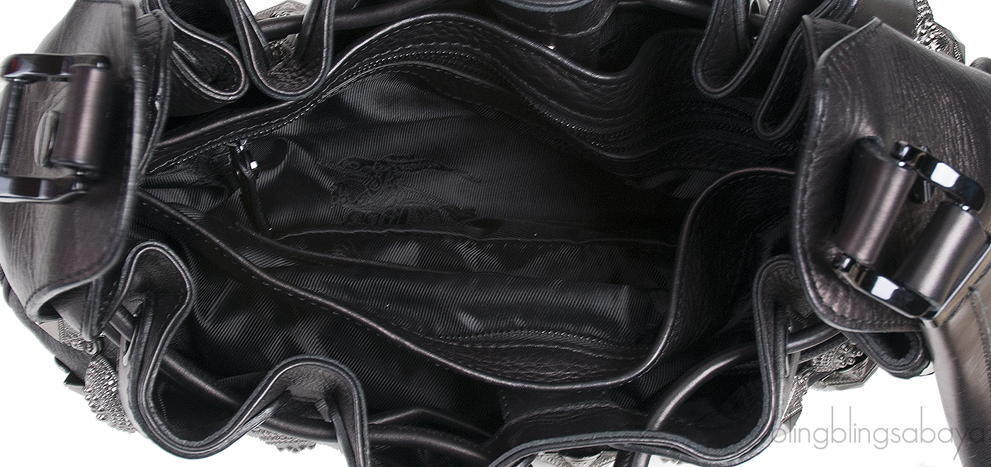 The roomy interior is fully lined with black fabric with four major compartment and one zip pocket and 2 pockets at front.