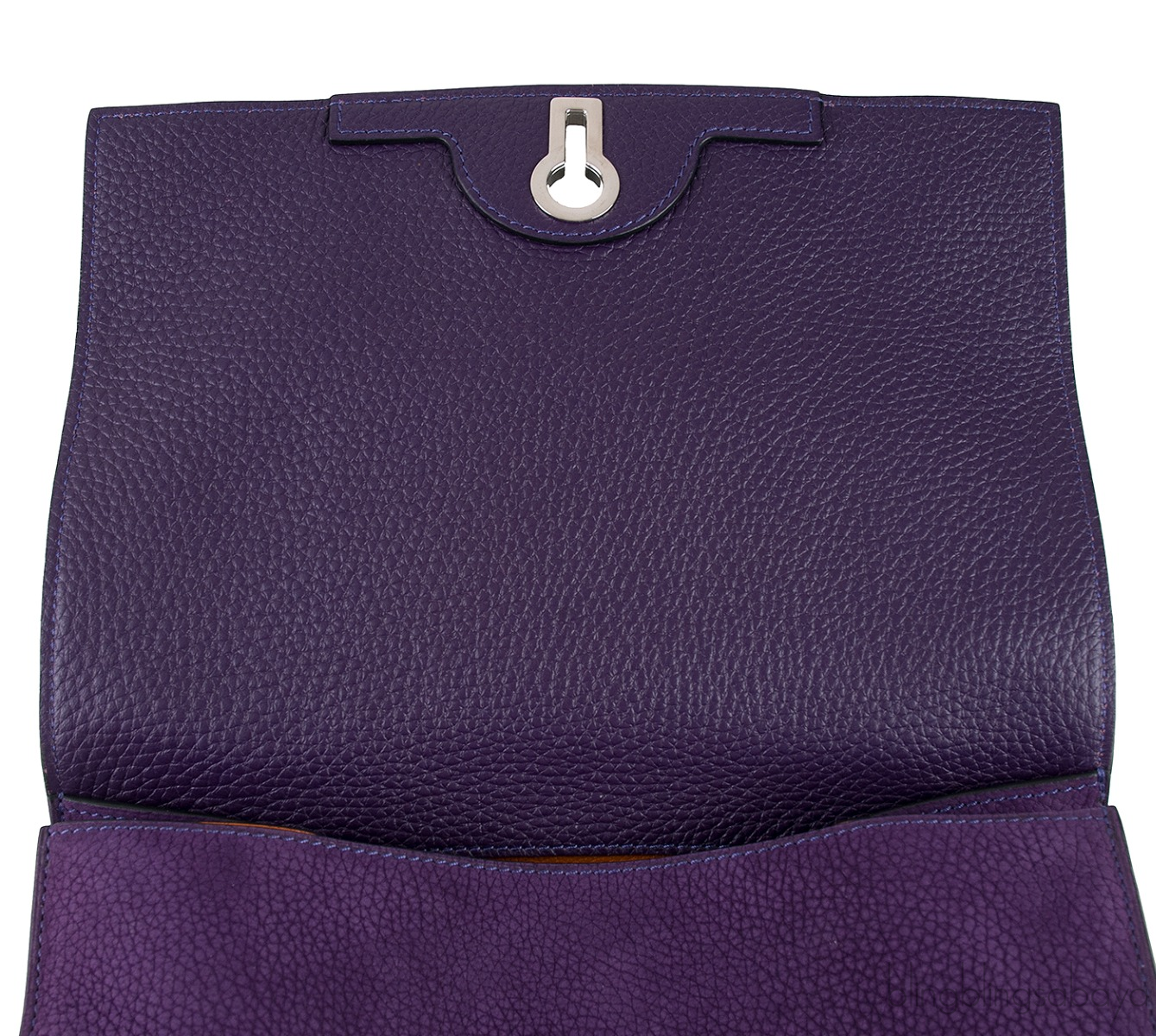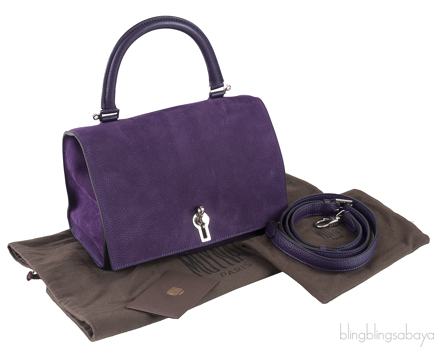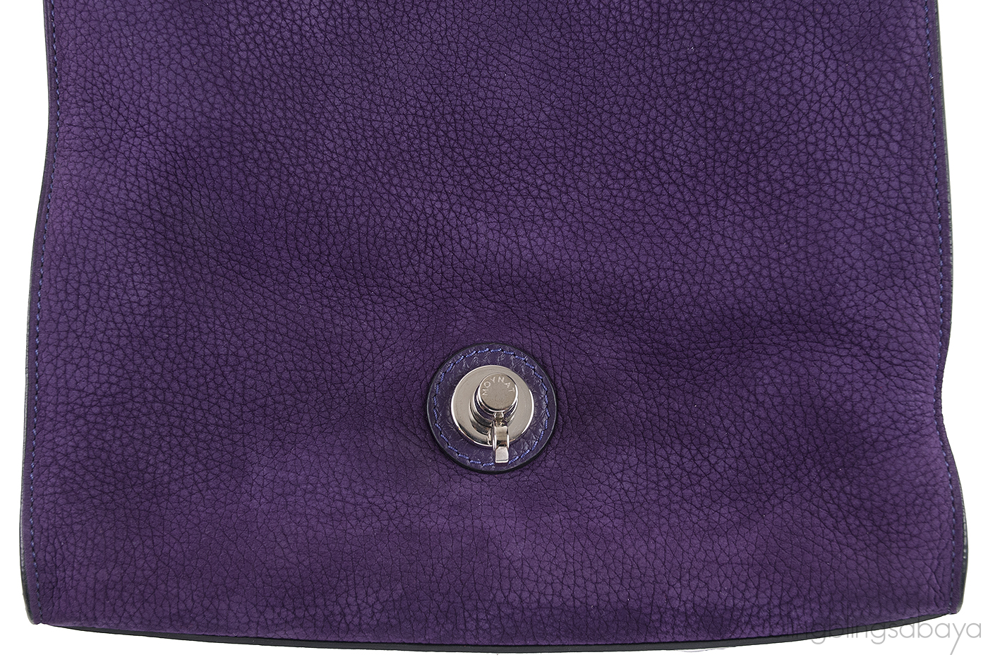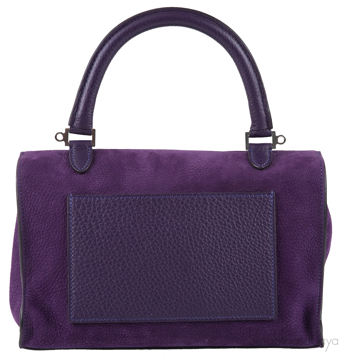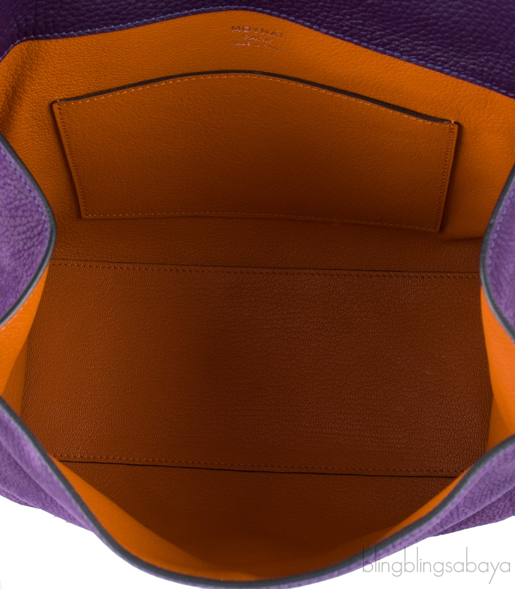This Purple Danse Bag PM from Moynat is crafted from bi-material the perfect mix ofTaurillon GexandTaurillon Nubuk otherwise known as suede accented with paladium hardware. This versatile soft bag features a flap cover secured on a silver turn closure. Interior is fully lined with goat skin leather in contrasting orange hue and has one patch pocket inside.