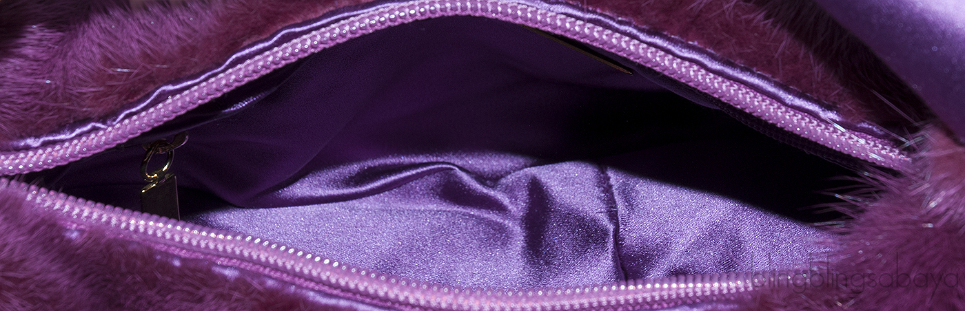 This Fur Crystal Handbag from Rene Caovilla is crafted in purple soft fur and satin fabric. This purse features a crystal embellished front with single handle encrusted with cystals. It has the top zip opening with fur tail zippered pull, interior is fully lined with satin fabric revealing on zip pocket and small slit pocket inside.