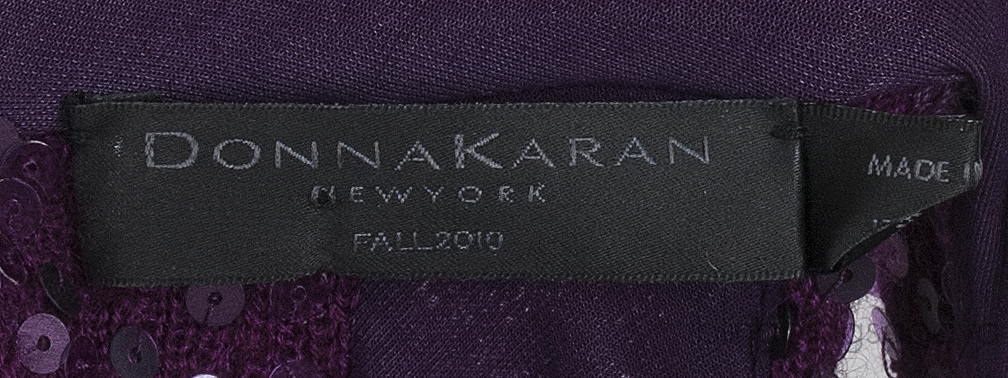 This Purple Sequins Sleeveless Top from Donna Karran is crafted from 70% Cashmere and 30% Silk in purple hue. This top features a sleeveless design with slouch neckline, cut-out at back, hook fastening, pull-over and fully decorated with purple squins.
