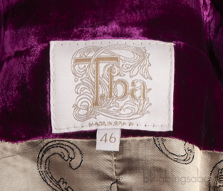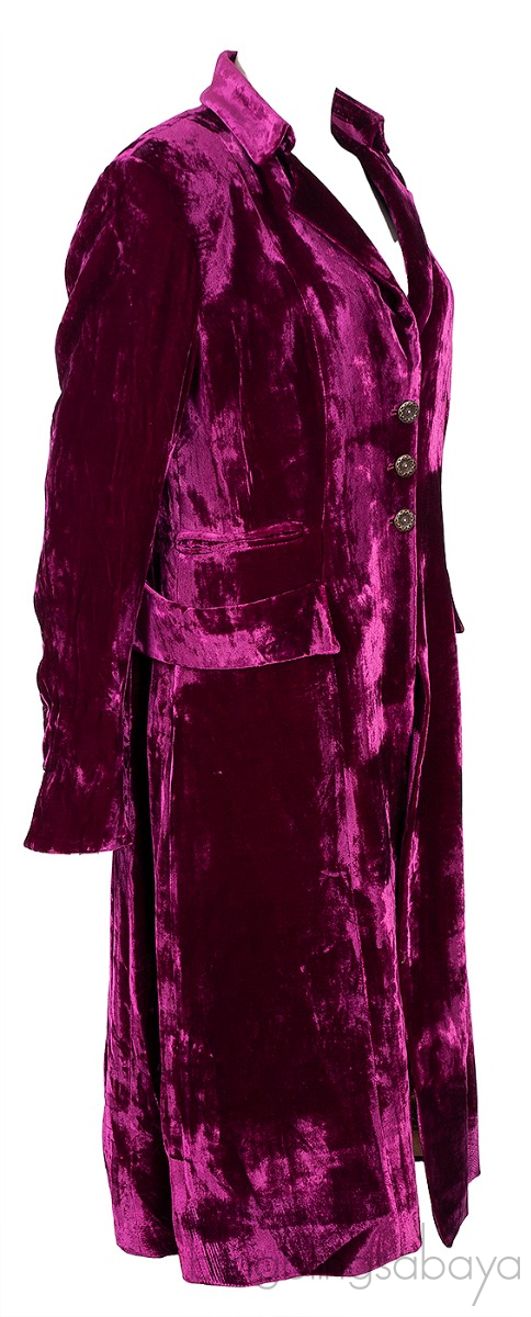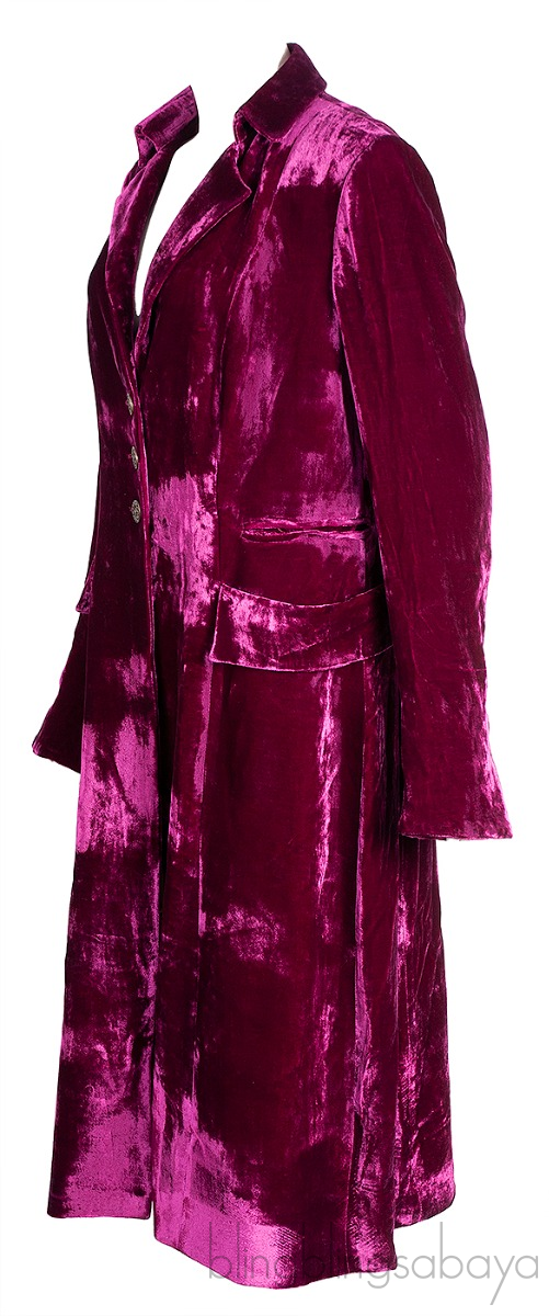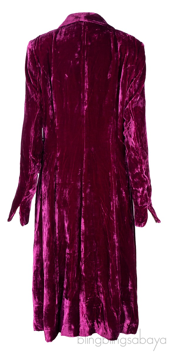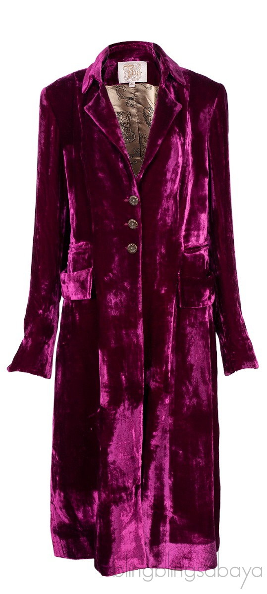 This Purple Velvet Trench Coat from T.ba is crafted from Purple Velvet fabric with gold printed lining. This coat features a classic collar, button fastening at front, long sleeves, faux welt pockets at front, and mid-length hem.