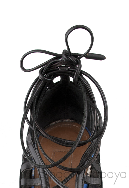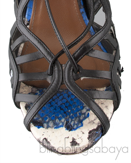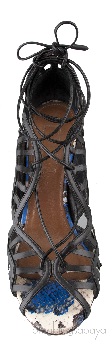 These Python Lace Up Heels from Aquazzura are crafted in multi-color python upper with black leather trimming and lining.These sandals features a lace-up front. peep almond toe, leather lined insole, stiletto heels measuring 100 mm high, and leather sole