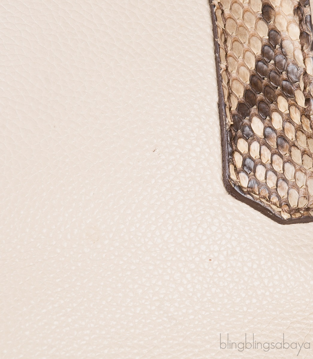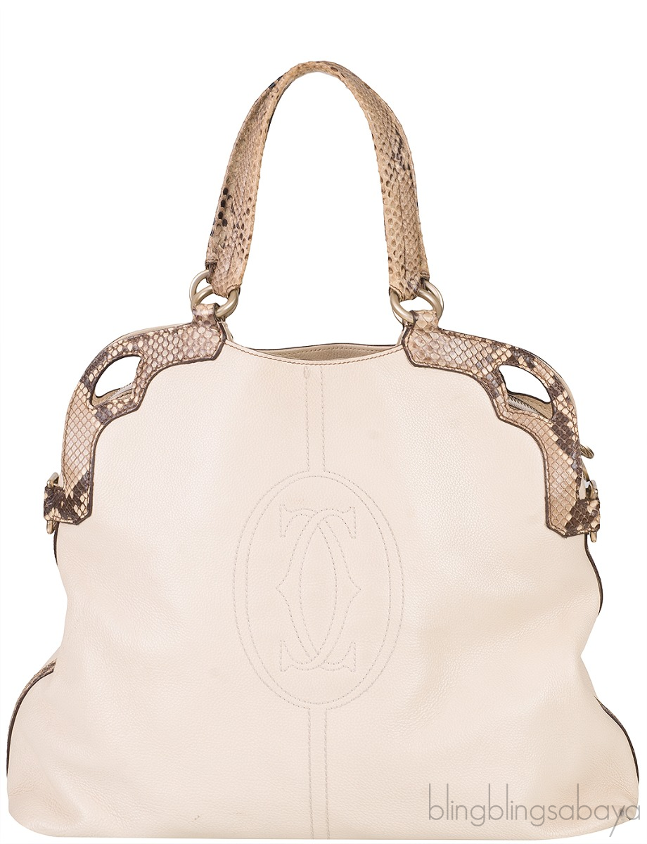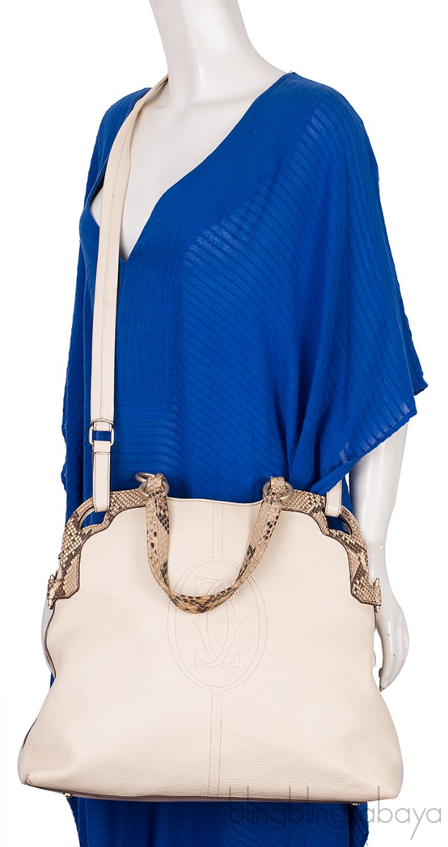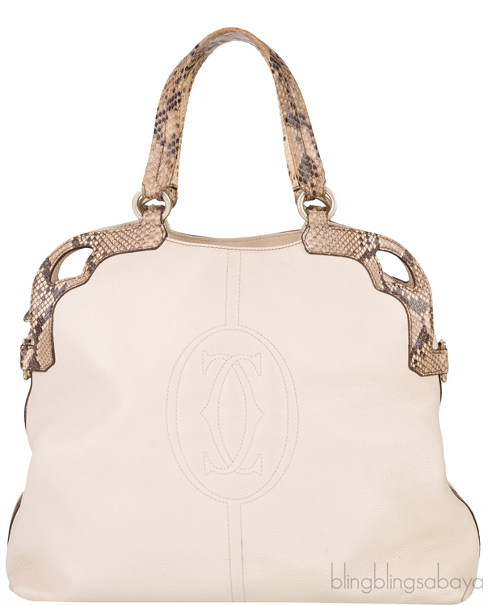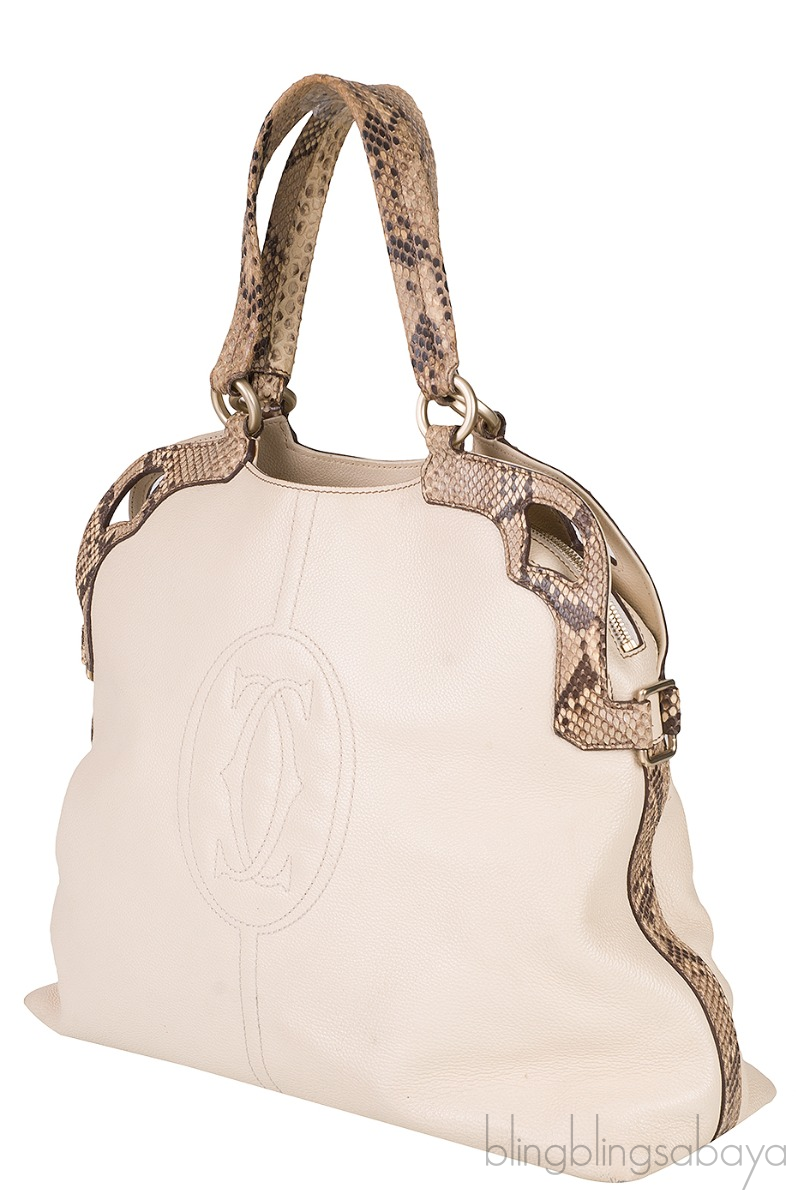 This Python Trimmed Marcello De Cartier Bag from Cartier is crafted from off-white leather trimmed with natural python leather and accented with matte light gold hardware.