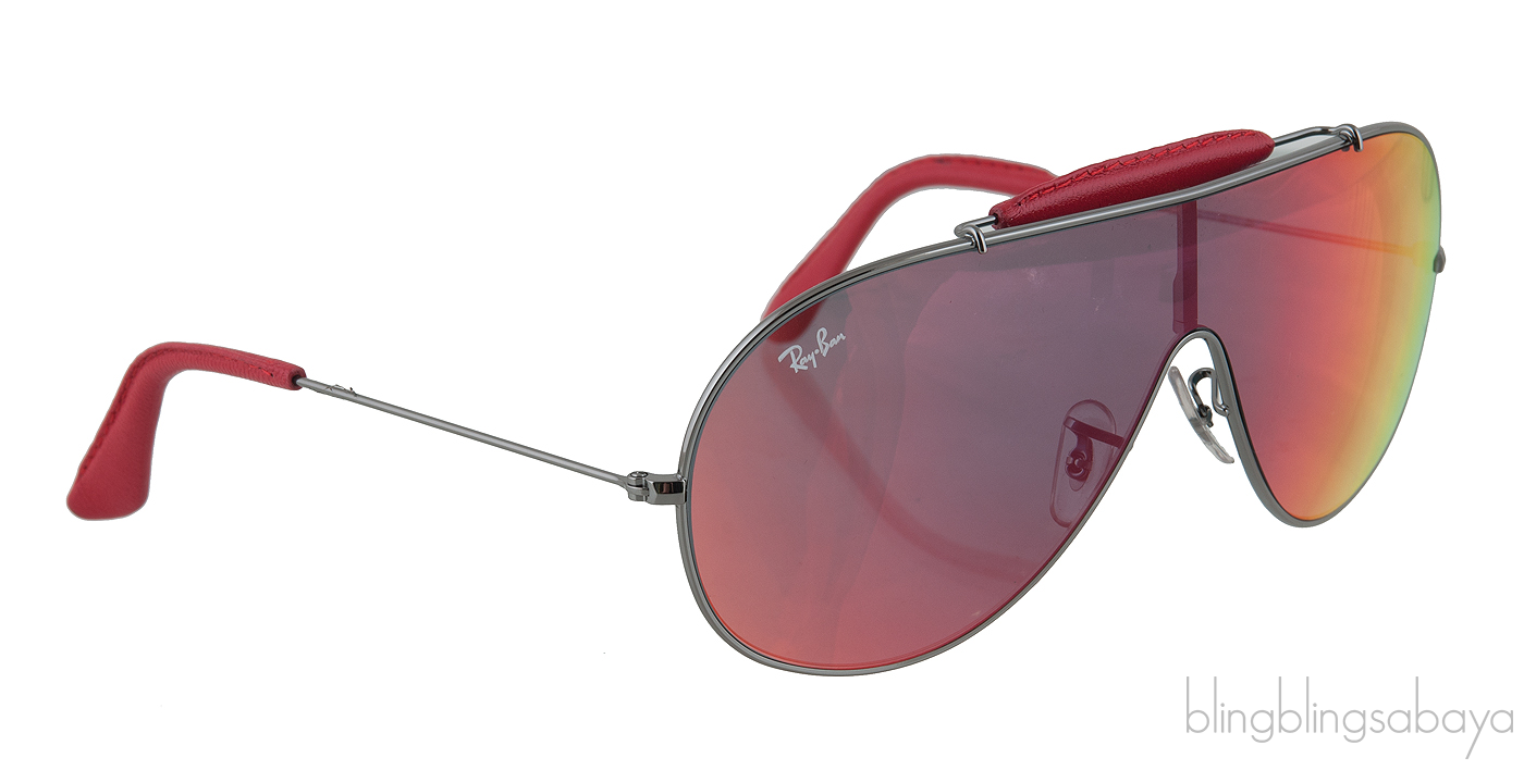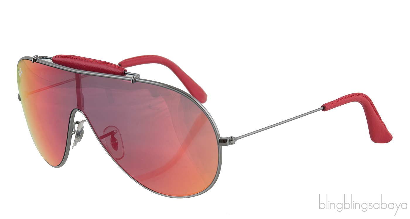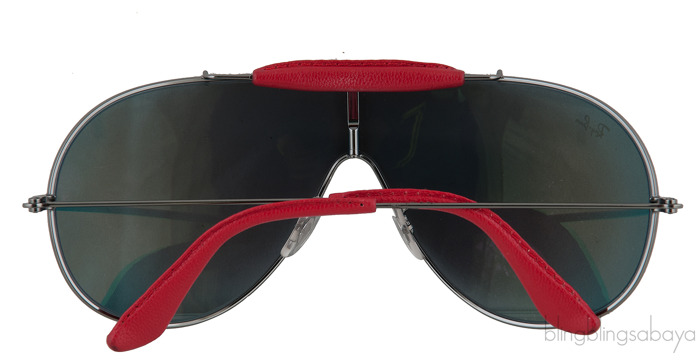 This RB 3416Q Sunglasses from Ray Ban features a gun metal frames with metal handles, sweat bars, burgundy leather accents on arm tips and top of frame.nose pads and aviator lenses.