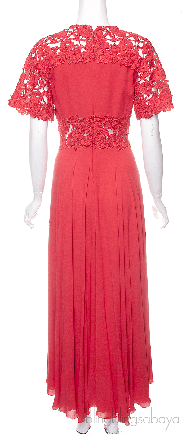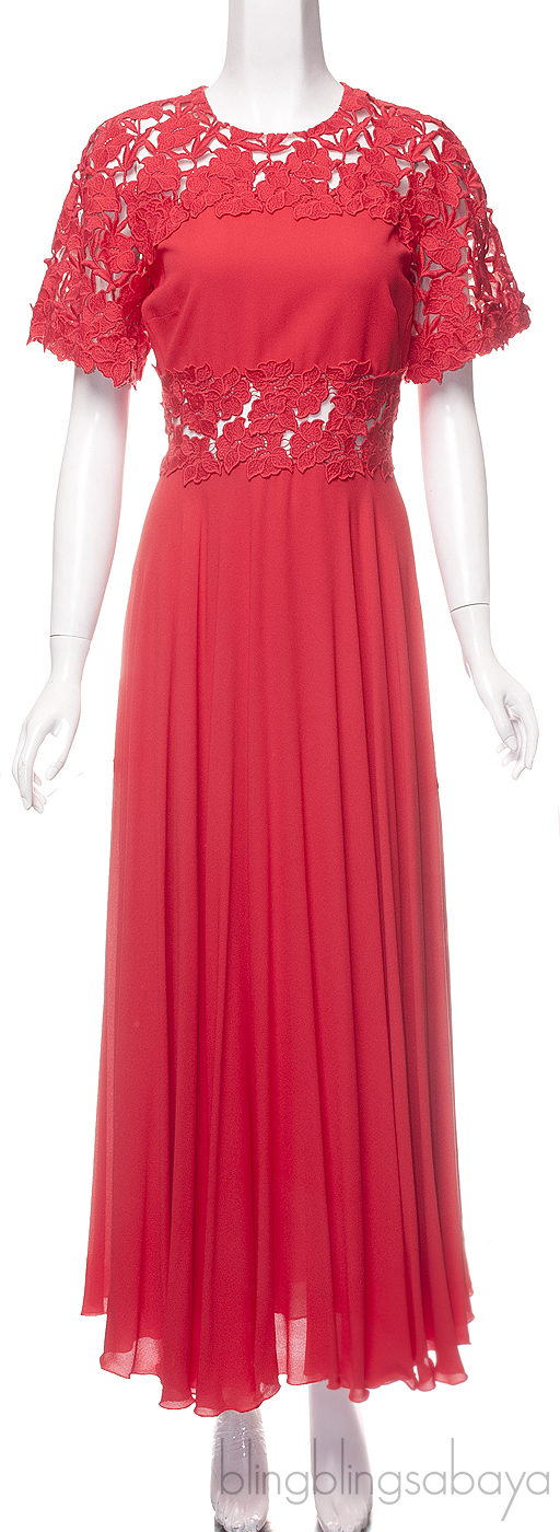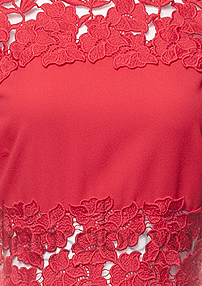 This Red Floral Lace Dress from Giambattista Valli is made of 100% Silk 2nd Fabric 80% cotton & 20% Polyester featuring a round neckline, short sleeve lace floral detailing at top and waist and flowy silk fabric on skirt.