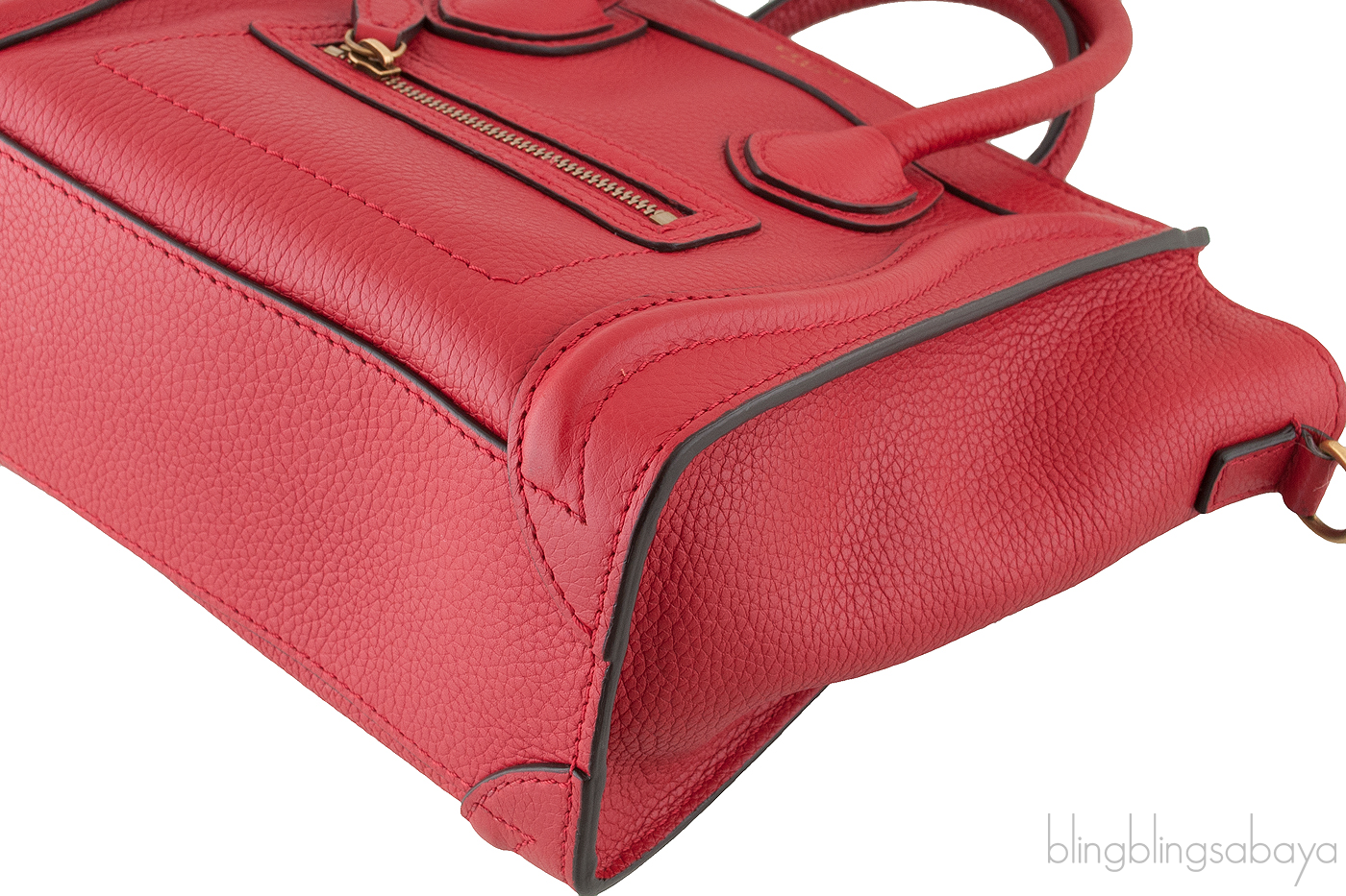 Add a dash of color to your wardrobe with this Nano Luggage Red color from Celine. Crafted in eye catching red grainy leather with a Gold Hardware. It has a vertical ridge on both sides that adds a stunning characteristic and has frontal zip.
