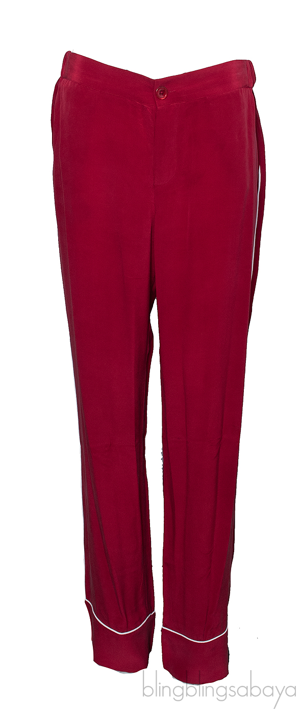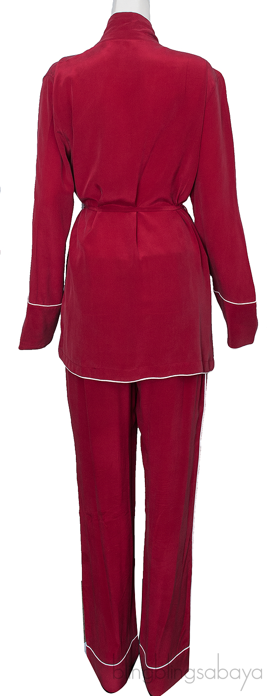 This Red Pajama Set from Equipment are crafted from 100% Silk fabric in red hue. Top features a long sleeves with two pockets, open front accompanied with string belt. Trouser features an elastic waist, button fastening at waist and slide pockets.