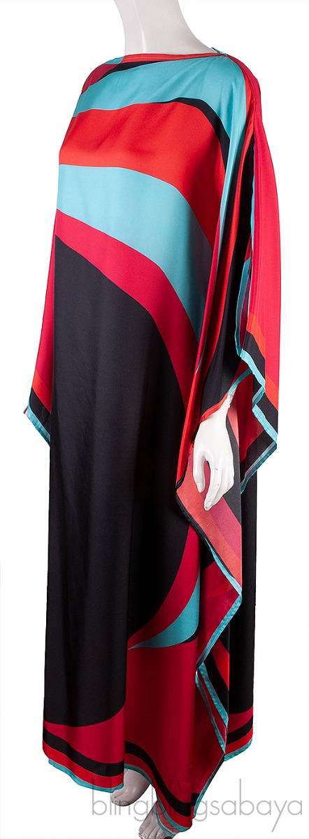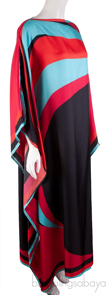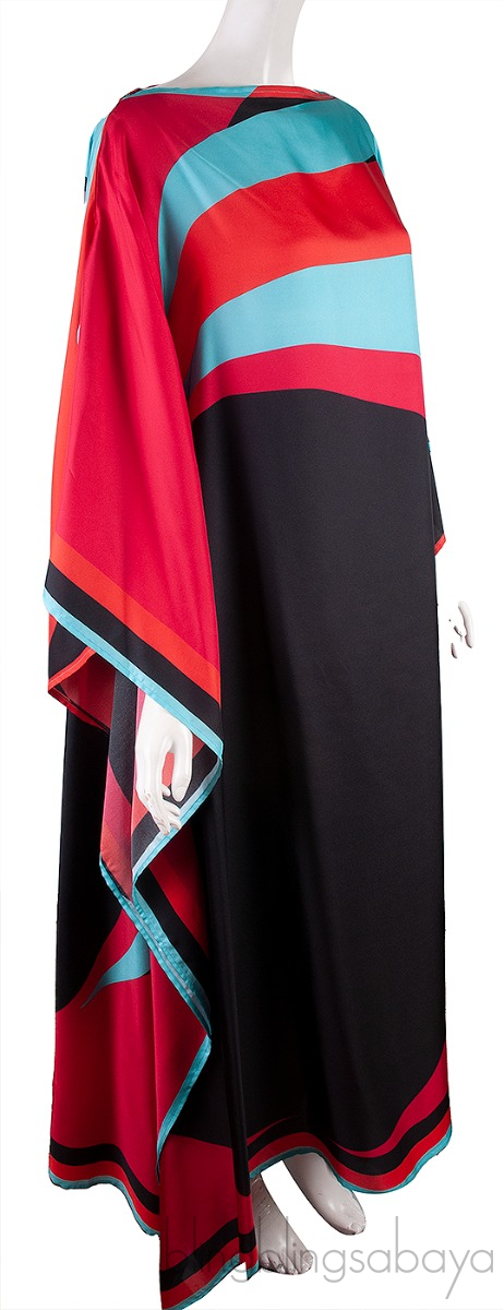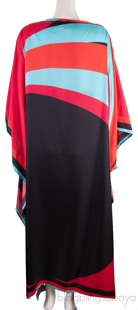 This Red Printed Kaftan Dress from Louisa Parris is crafted from 100% Silk fabric featuring an abstract print in black, red, fuchsia and teal color cut in a simple scarf dress shape with drape sleeves and a boat neckline