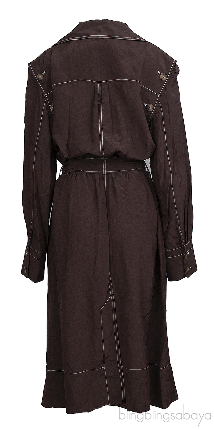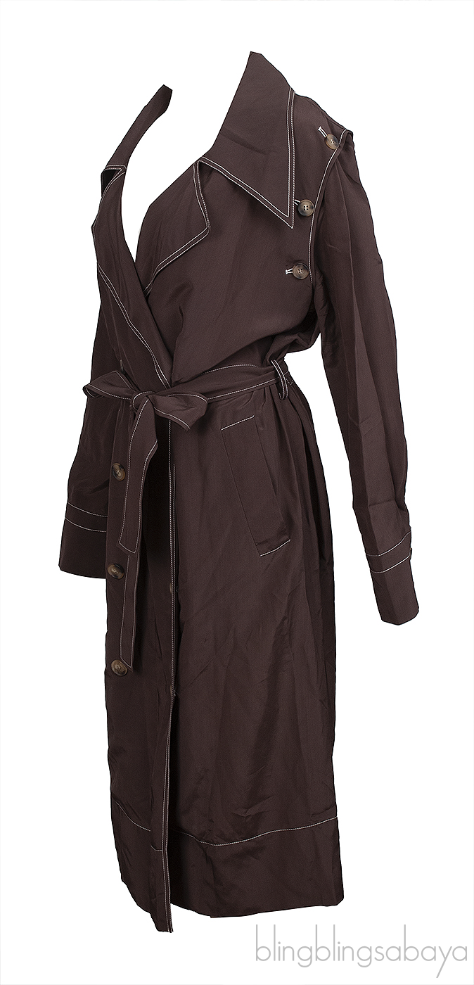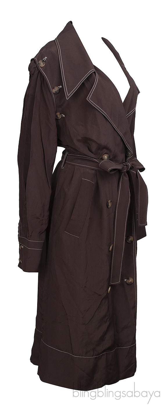 This Rejina Pyo trench coat is made from 100% viscose in a rich brown tone. It showcases cream contrast stitching and includes a pointed collar, double-breasted front, long removable sleeves, an elasticated back waist, button closures, and a detachable fabric belt.
