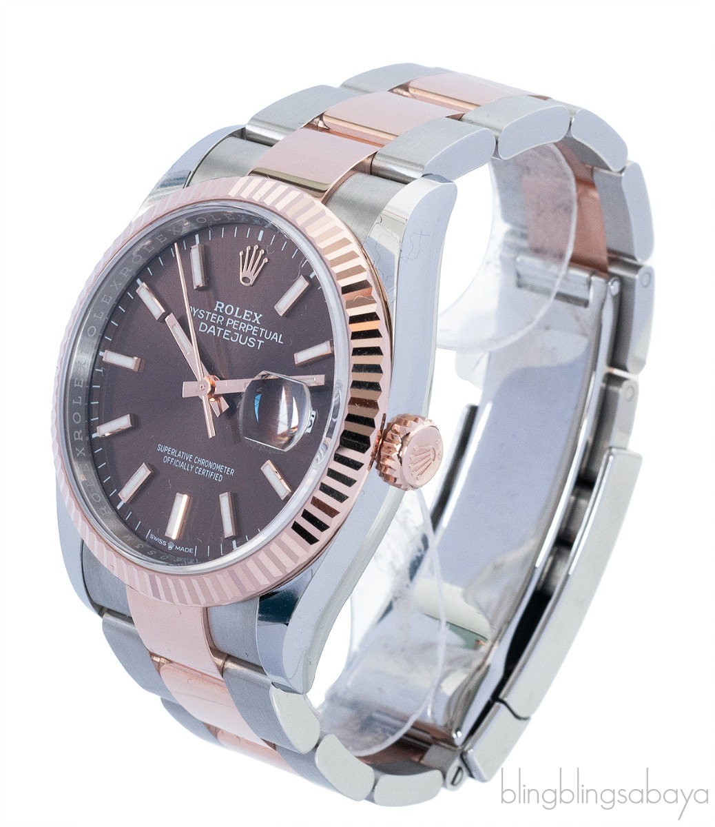 This Datejust 36 Oyster Perpetual Everose Automatic Watch from Rolex is crafted in oystersteel and rolesor everose gold 36 mm case and bracelet. This stunning watch features a fluted bezel and chocolate dial with sunray finish that creates delicate light reflections. It has an automatic movement, waterproof to 100 meters and approximately 70 hours power reserve.