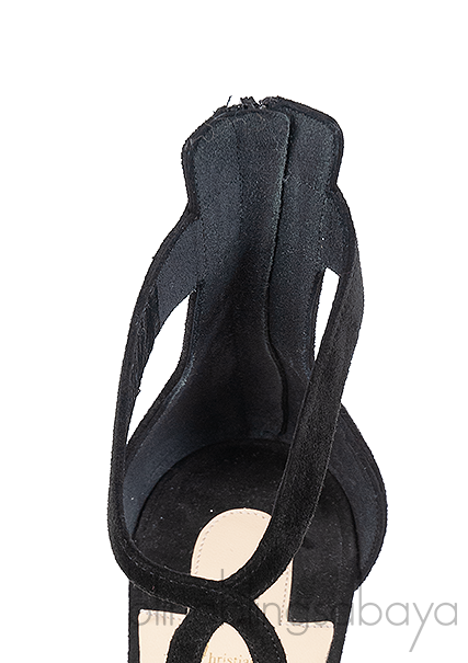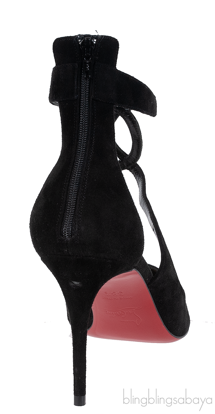 These Rosas 85 Black Suede Heels from Christian Louboutin are crated from black suede upper leather with nude leather lining. These heels features a pointed toe, cross strap at top, zip fastening at the heel counter, leather lined insole, red signature sole and high heels measuring 3.5 inches high.