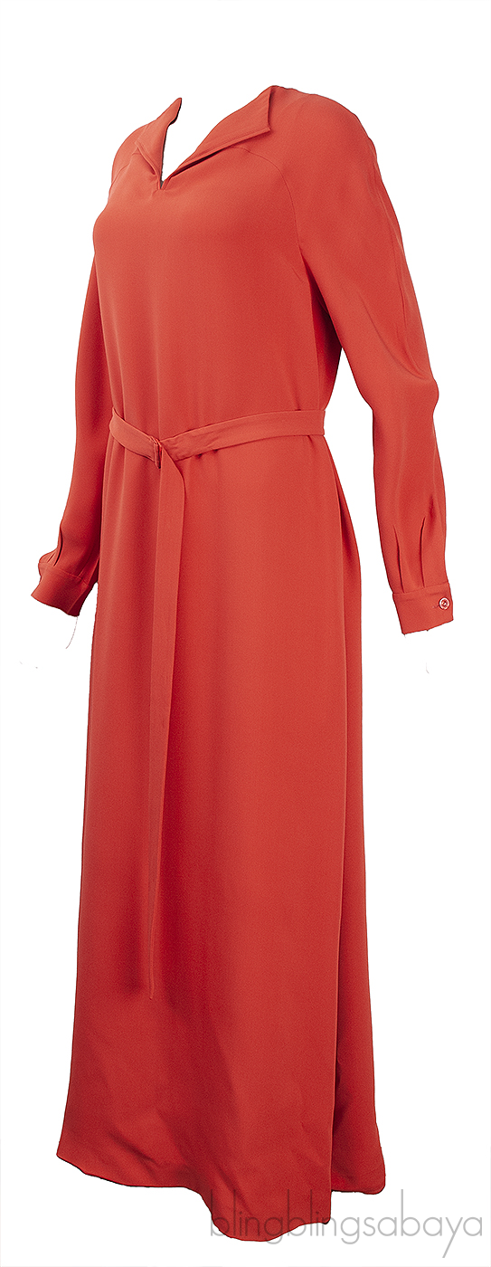 This Rust Orange V-neck Belted Maxi Dress from Loro Piana is crafted from 100% silk fabric in rust orange featuring a v-neckline, long sleeves with buttoned cuffs, maxi length and comes with detachable belt to cinche the waist.