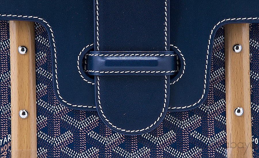 The canvas features a dot that forms in "Y" that stands for the central letter in the "Goyard" family name.The sturdy structure is incorporated with a wooden handle and wood strips on the front. This classic timeless piece is secure by a leather flap that is belted down. Interior is lined with a vibrant yellow cotton fabric with Goyard signature stamp and has one zippered compartment inside.