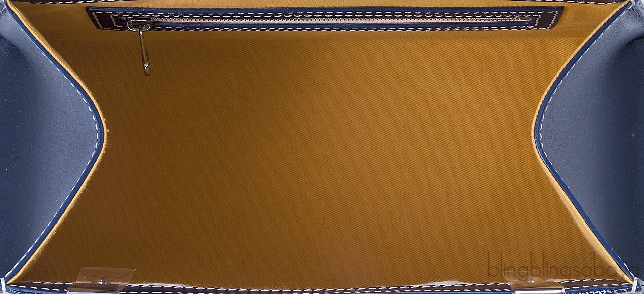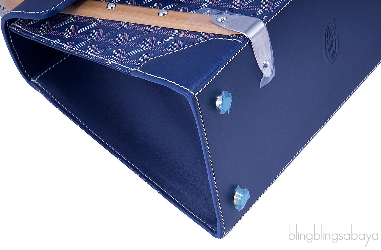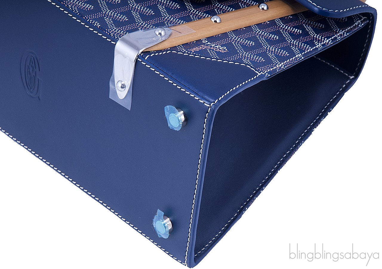 Most awaited masterpiece from the oldest and most prestigious trunk maker of all time is here, the Goyard Saigon PM. This so cool Saigon handbag is made in a Navy Blue signature Chevron Canvas and Cowhide Leather with a white contrasting stitches.