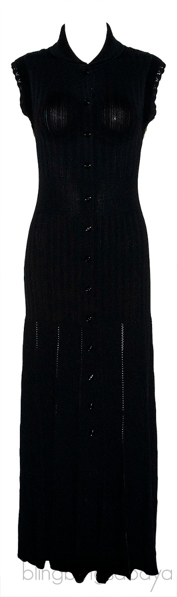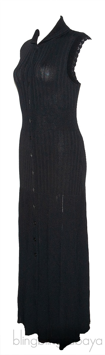 This Black Knitted Dress from Sandro is crafted from 76% Viscose, 21% Polyamide, 3% Elastane. This dress features a black knitted fabric, round collar, sleeveless, button fastening through the front and midi-length.