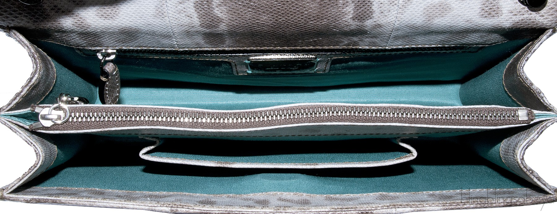 The single flap opens to reveal the interior lined with canvas and has one internal large pocket with enamel Serpenti head zipper pull, one small zipped pocket and one open pocket inside.
