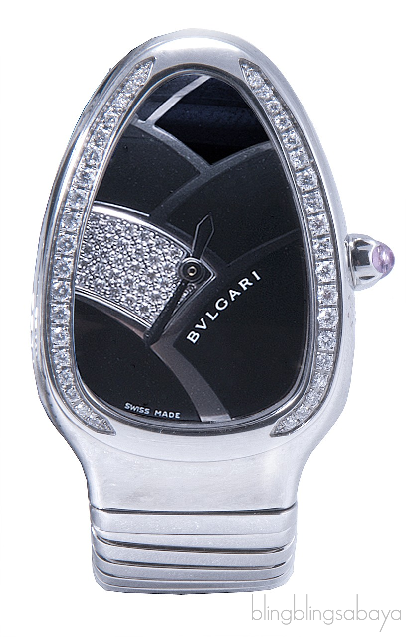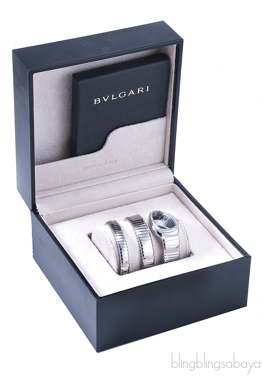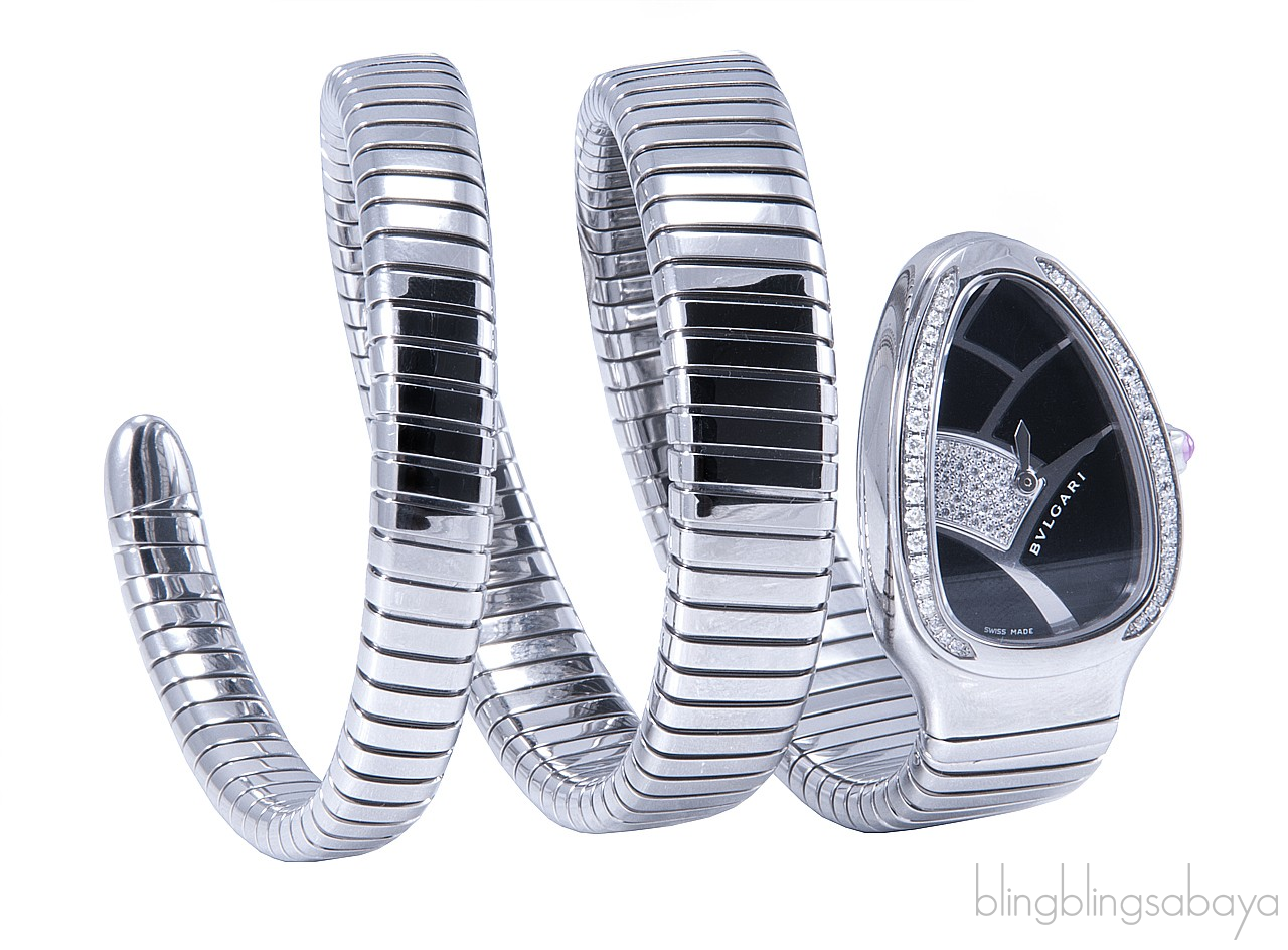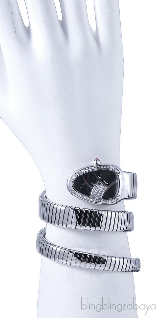 This elegant and too feminine timepiece is in quarts movement that features two Bulgari signatures, the snake head symbol and the two twirl steel Tubogas bracelet.