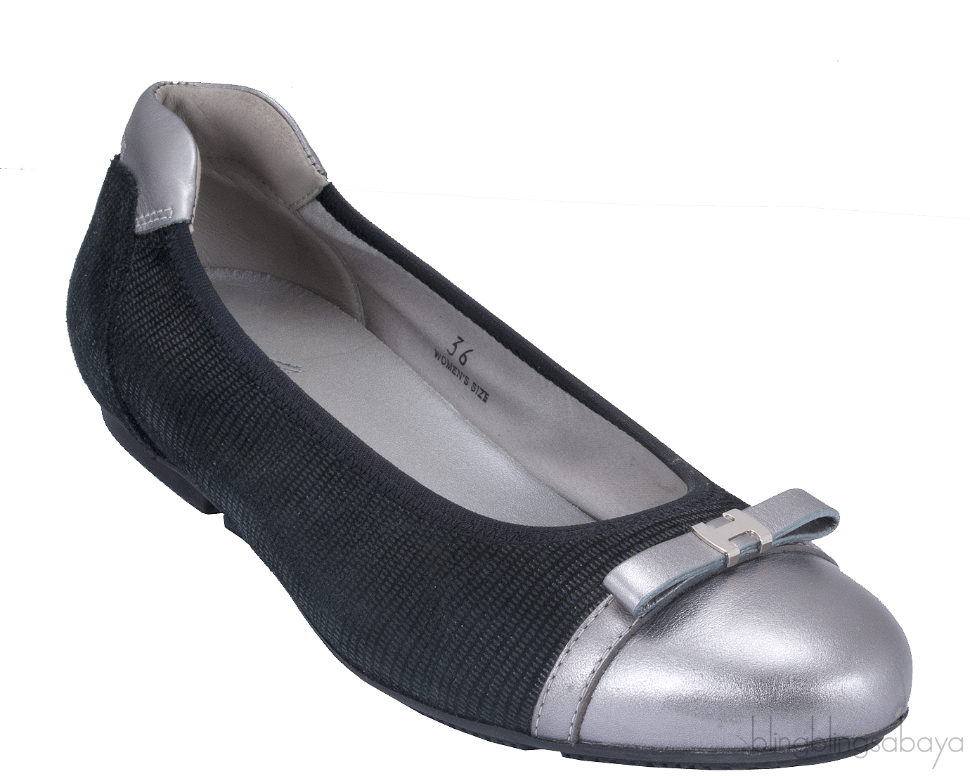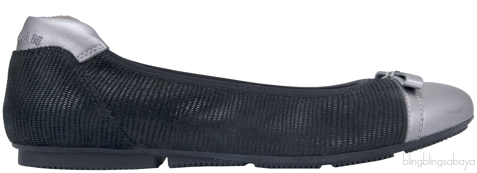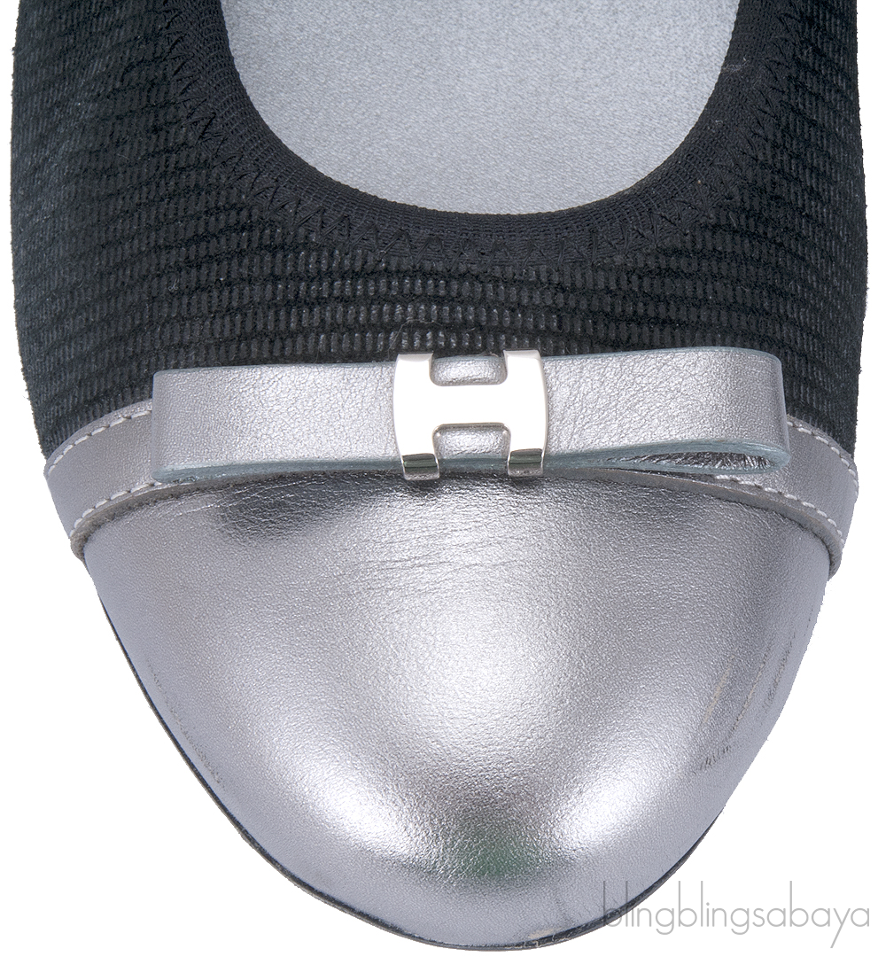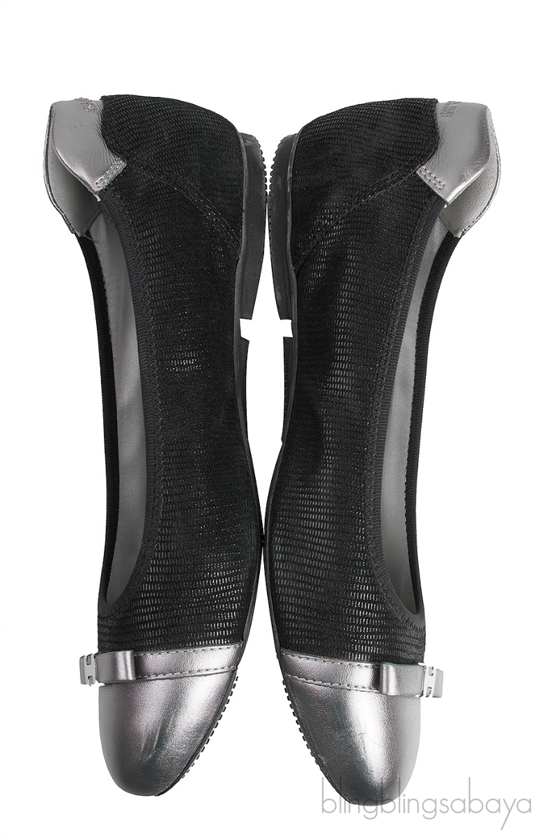 This Silver Cap Toe Ballet Flat from Hogan is crafted in black reptile printed soft nappa leather with silver leather detailing featuring an almond cap toe with cute mini bow at vamp and H silver metal logo2, embossed hogan logo2 on the silver leather counter heel tip, leather lined insole & rubber sole.