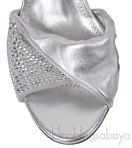 These GIUSEPPE ZANOTTI Silver Crystal Embellished Vamp Slingback are crafted from metallic silver leather upper with leather lining. These heels features a peep almond toe, crystal embellishment at front, slingback, leather lined insole and 80 mm high heels.