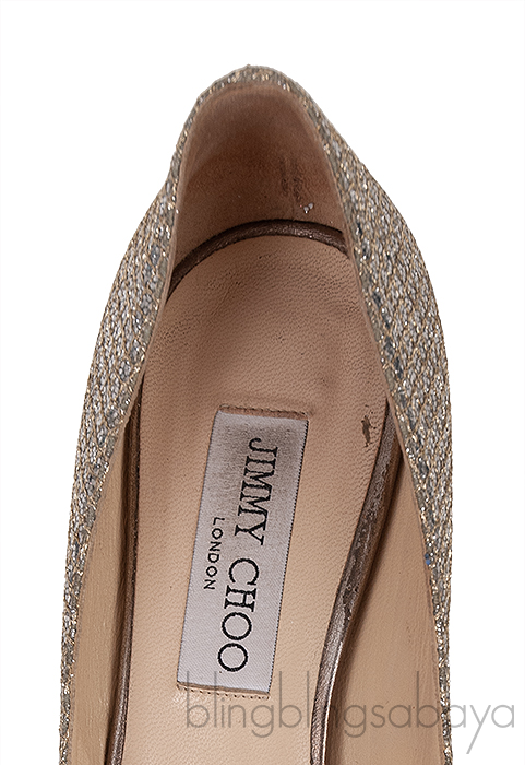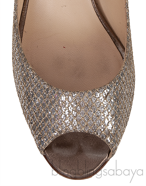 This pair of Silver Glittery Peep Toe Pump from Jimmy Choo is crafted in silver glitter upper with beige leather lining. This features a peep almond toe, leather lined insole and sole and a covered heel measuring mm.