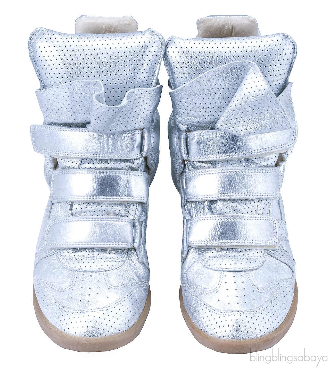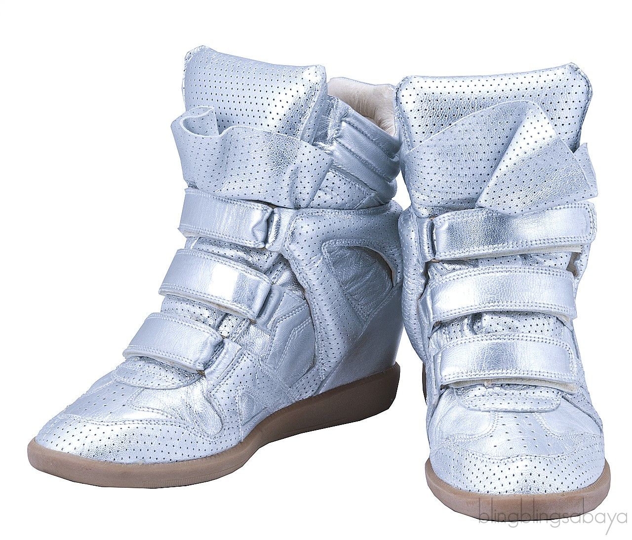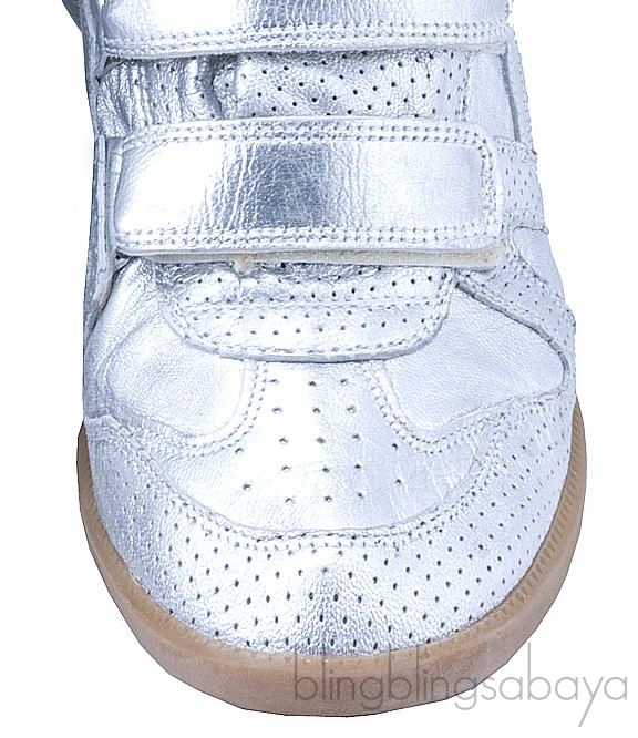 This trendy highly-fashionable sneakers from Isabel Marant is crafted in a smooth silver metallic perforated leather. This very popular very limited sneakers has a 7 cm high built-in wedge heels with high top design, Velcro fastening, leather insole and natural rubber sole.