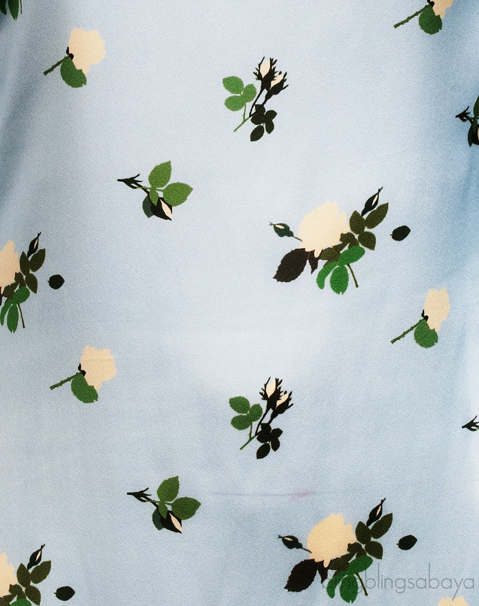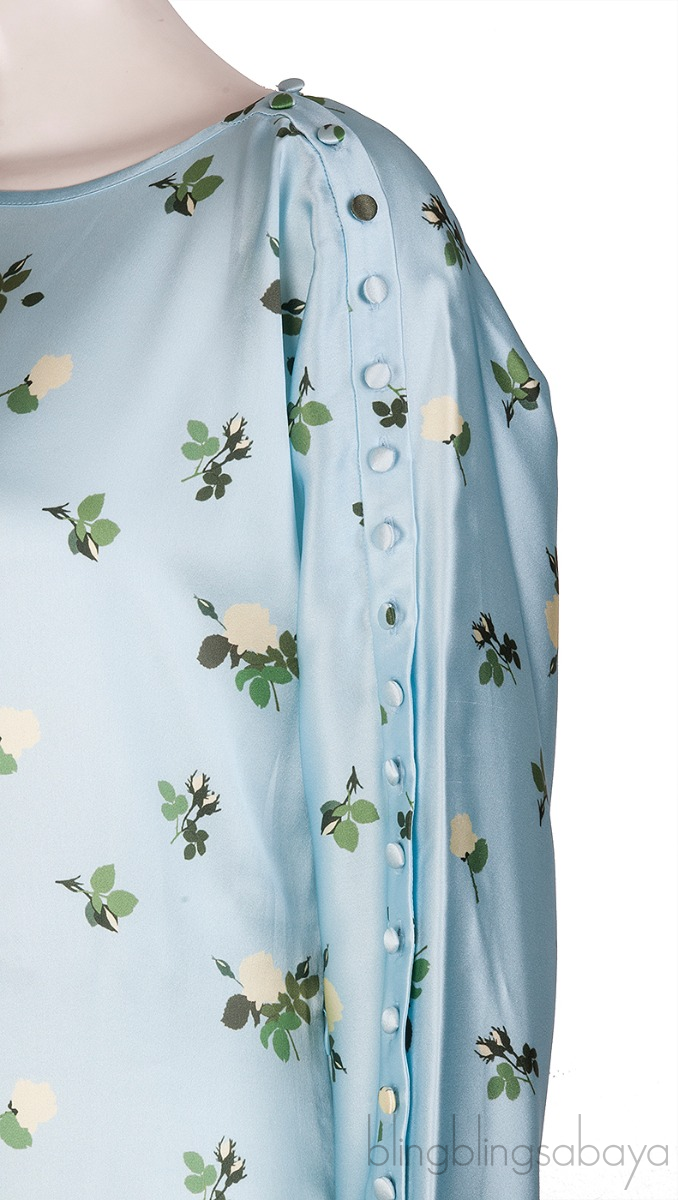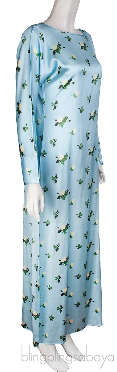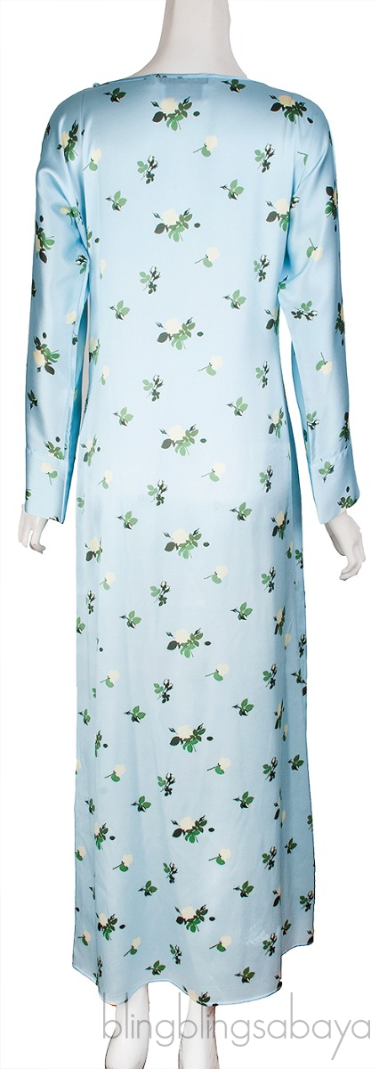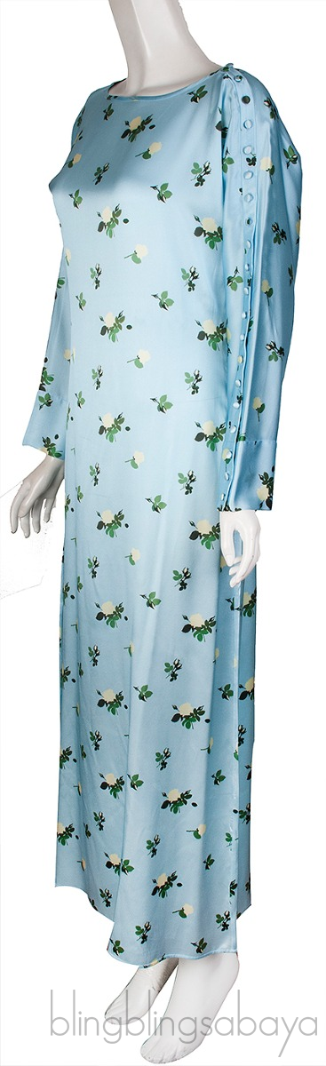 This Light Blue Floral Maxi Dress from Bernadette is crafted from 95% Silk and 5% Elastane in sky blue color with green and cream floral print all-over. This dress featues a bateau neckline, buttoned design from shoulder through the left sleeves, maxi length and zide zip fastening.