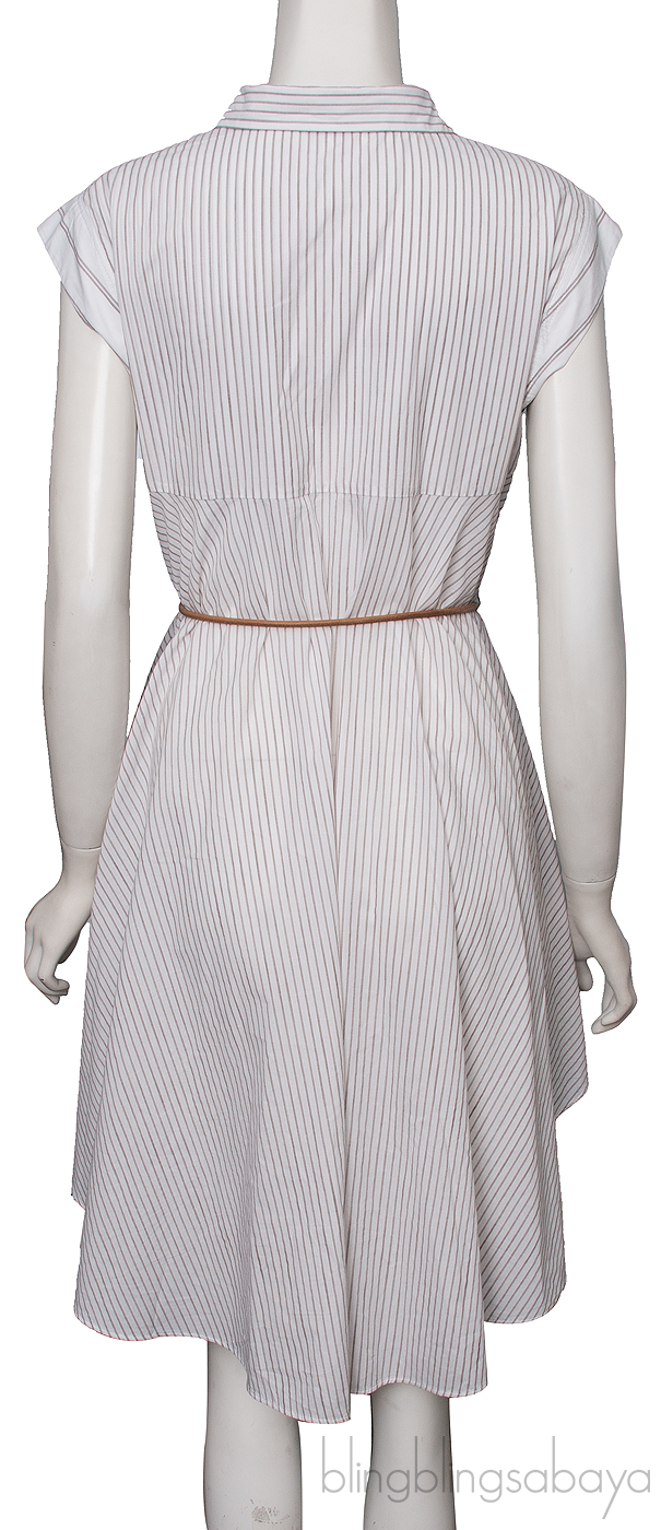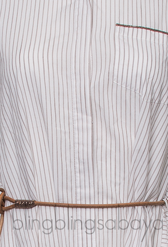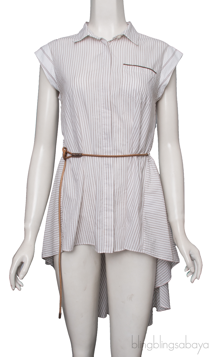 This Sleeveless Long Back Top from Brunello Cucinelli is crafted from 100% Cotton fabric in white with light brown striped printing featuring a classic collar, sleeveless, button fastening down the front, pocket with metal chain tiem, belt loops with detachable brown belt and long back hem.