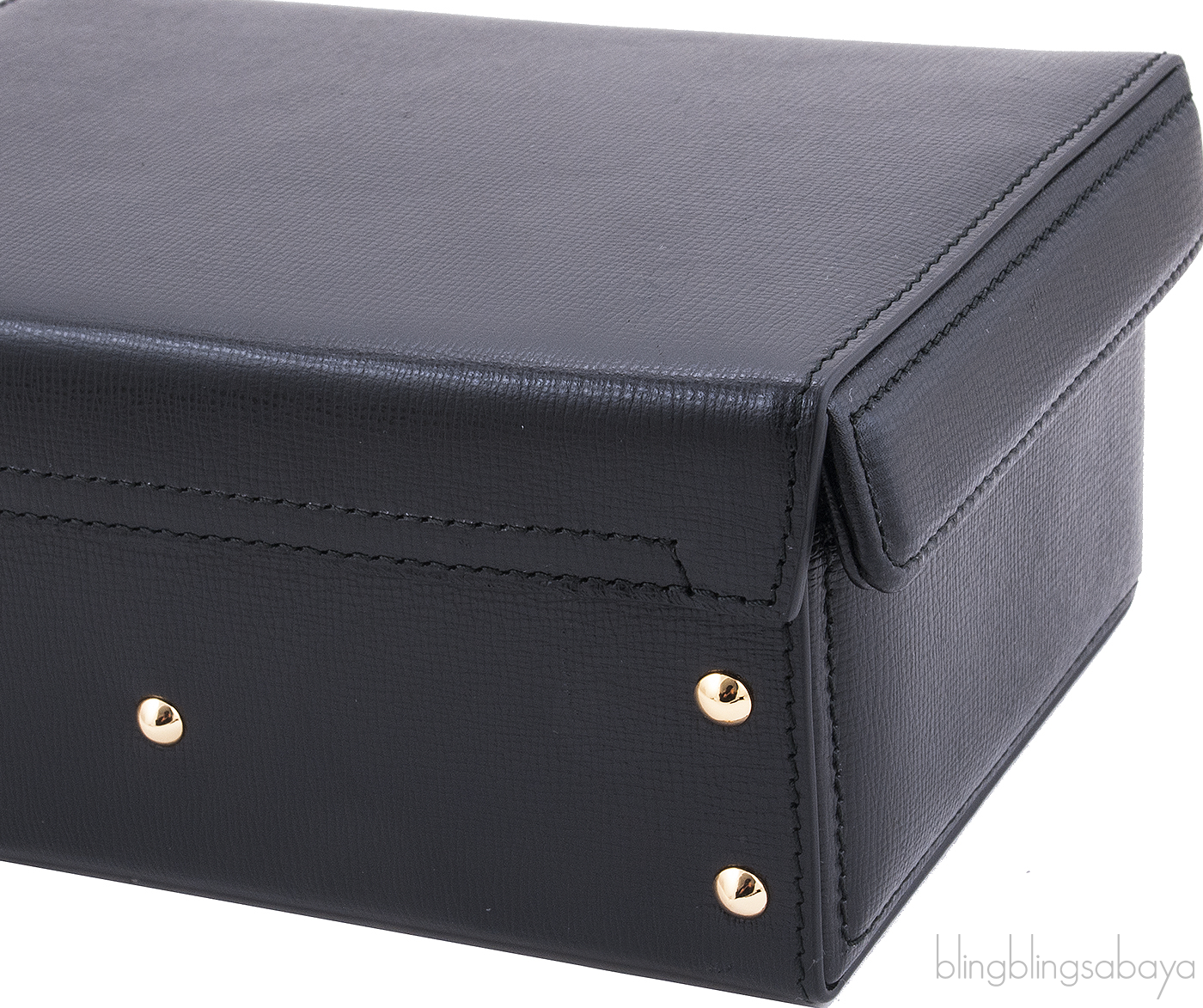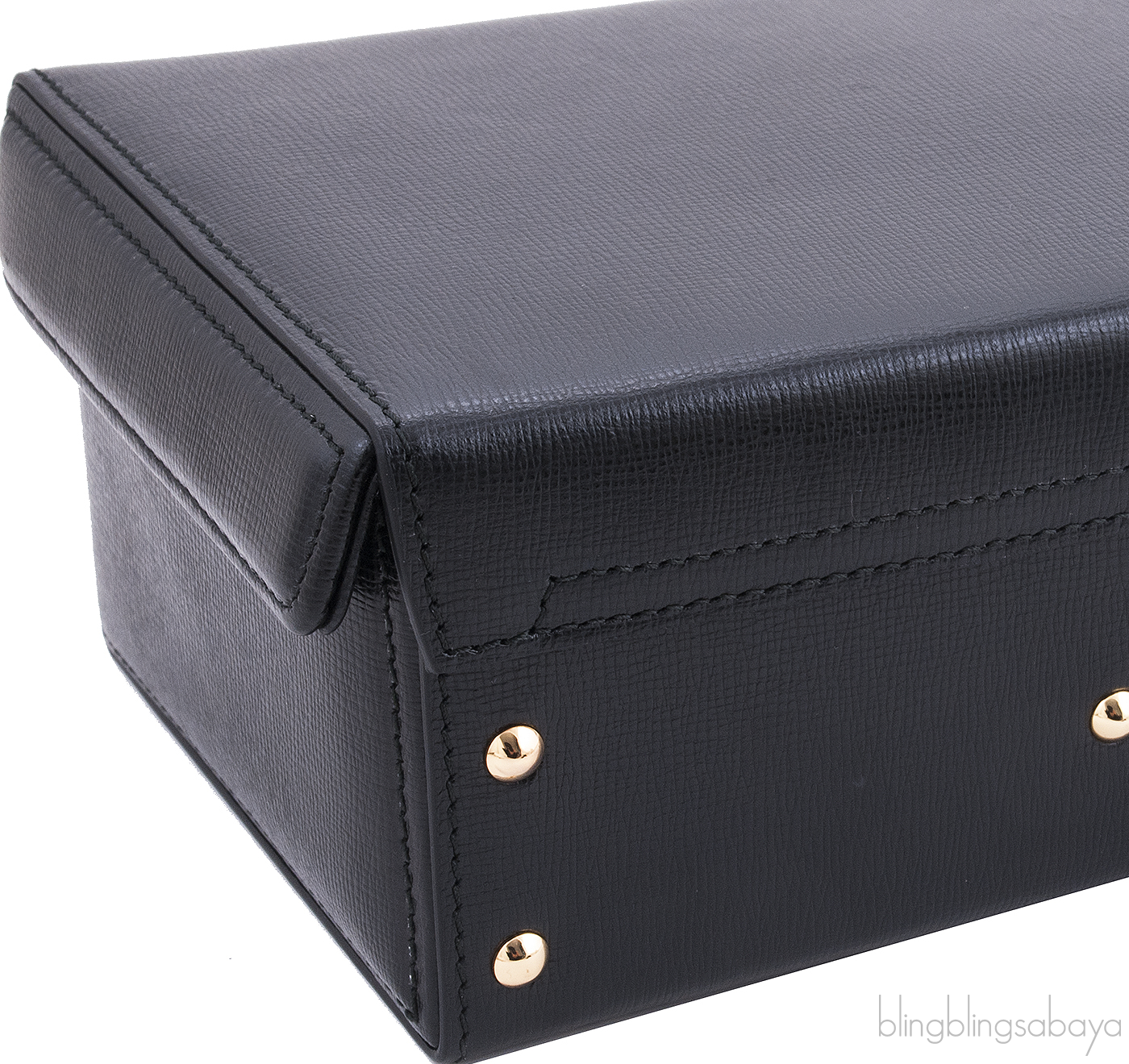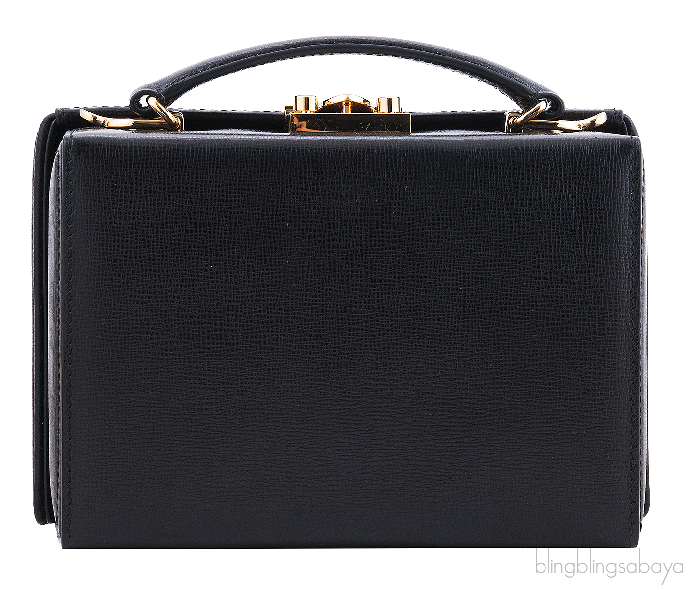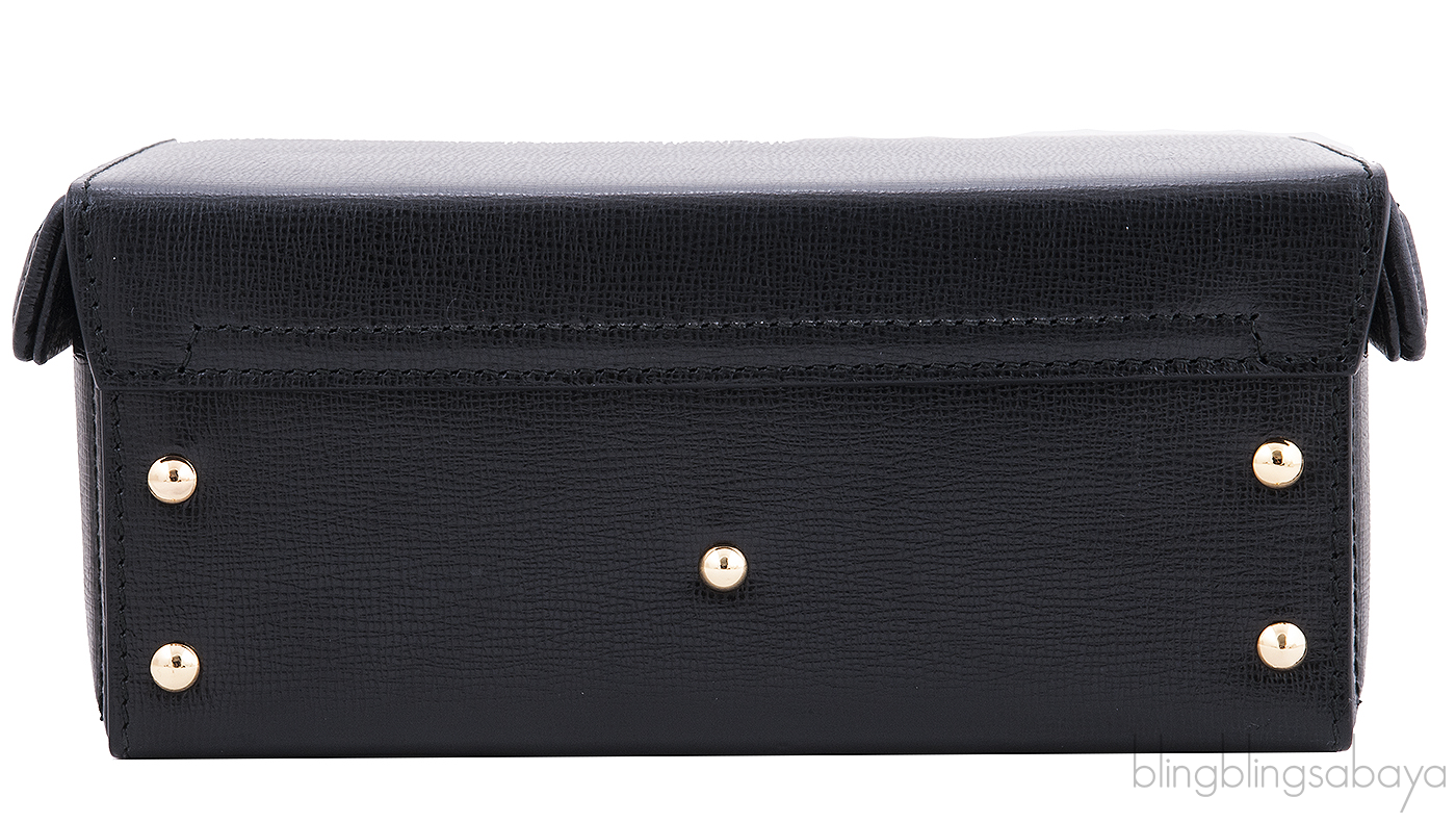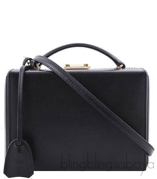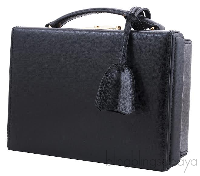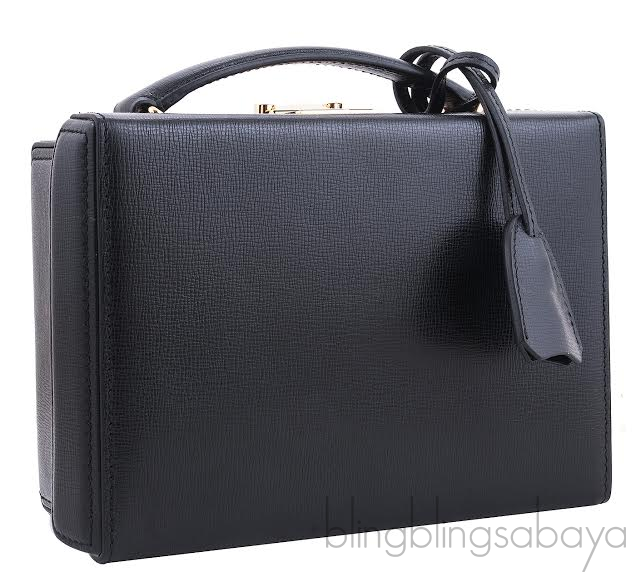 This Small Grace Black Hard Clutch from Mark Cross is crafted in black saffiano leather accented with golden hardware. This sophisticated bag features a smart, structured silhouette, polished hardware and signature red-leather lining. It has flat top leather handle and comes with removable adjustable crossbody strap. Push lock closure at top and had roomy interior fully lined with leather with interior zip pocket.