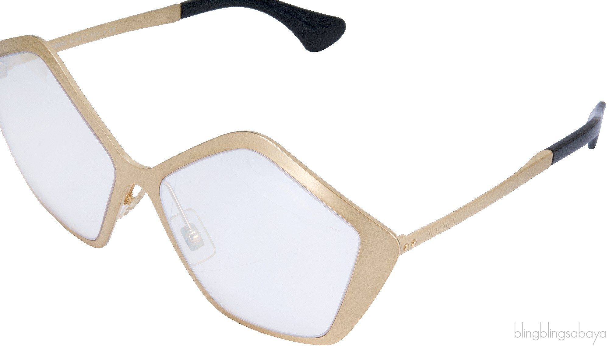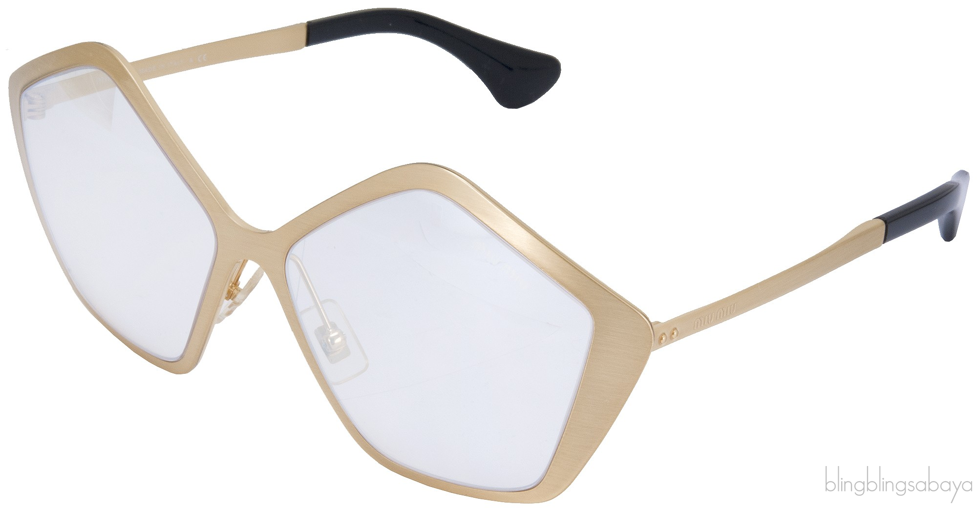 This SMU53N Geometric Gold Sunglasses from Miu Miu features a hexagonal golden brass frame with transparent lenses and golden brass handles. Lens Measures 57 mm / Bridge 15 mm / Arm Length 140 mm.