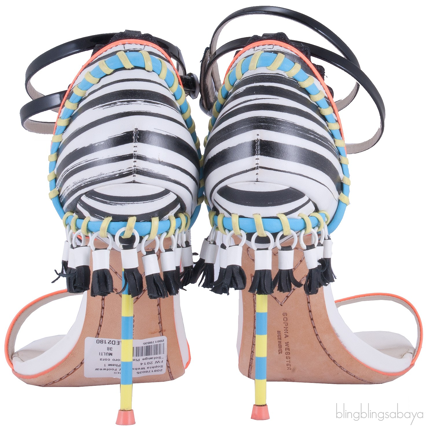 This Solange Tassel-Fringe Sandal from Sophia Webster is crafted in eye-catching multicolor patent leather with mixed prints. This alluring sandals features a thin orange patent vamp, open almond toe, black buckled ankle strap. tassels trim heel counter, leather lining with footbed, multi-color stilleto heels measuring 7 cm high and leather sole.