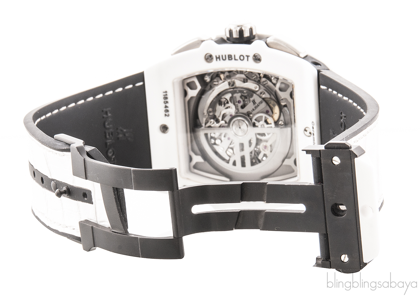 This Hublot Spirit of Big Bang in White Ceramic from Hublot features a fixed microblasted white ceramic bezel with scratch resistant sapphire crystal and transparent case back. Tonneau case shape measuring 51mm x 45mm paired with White "Gummy-Alligator" strap Alligator on the top-side & black rubber on the underside & edges. Skeleton dial with luminous silver-tone hands and index hour markers, Date display between the 4 and 5 o'clock positions. Chronograph - three sub-dials displaying 60 second, 30 minute and 12-hour.