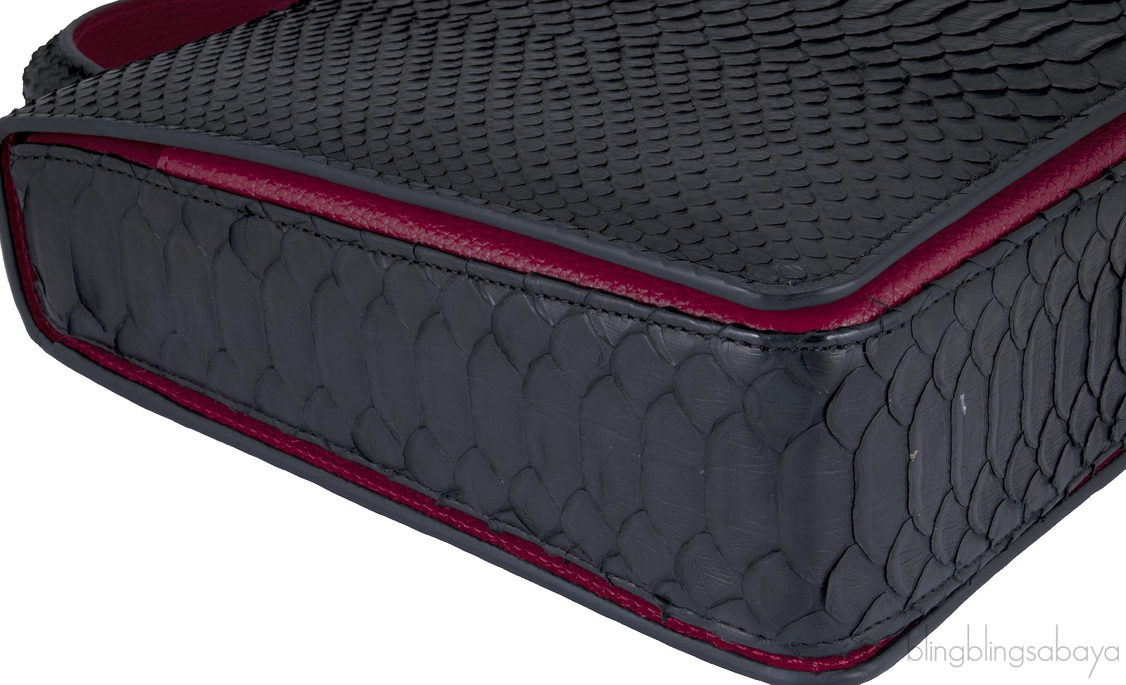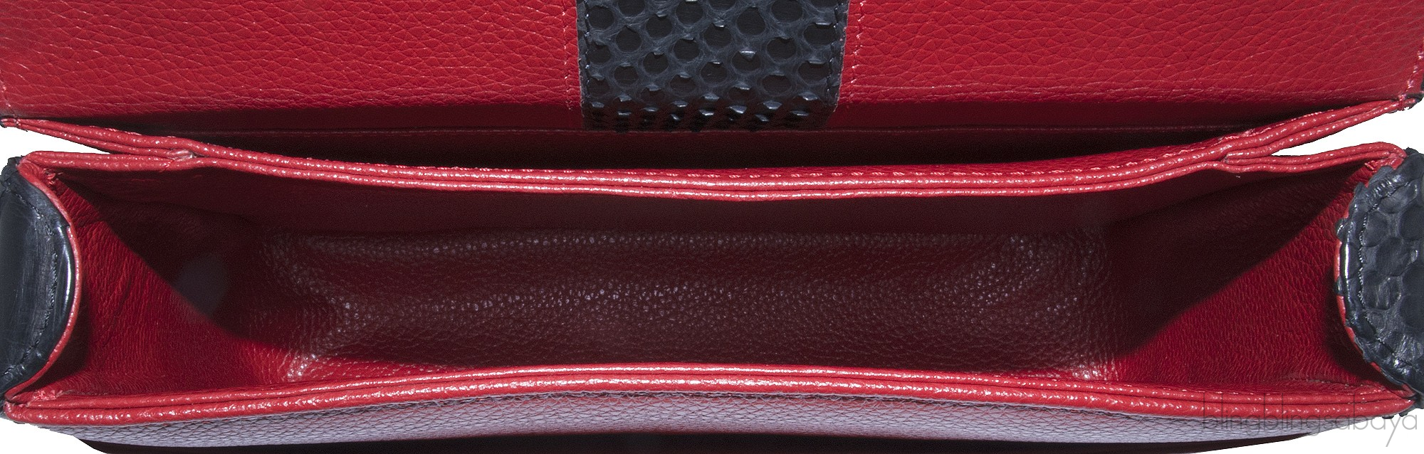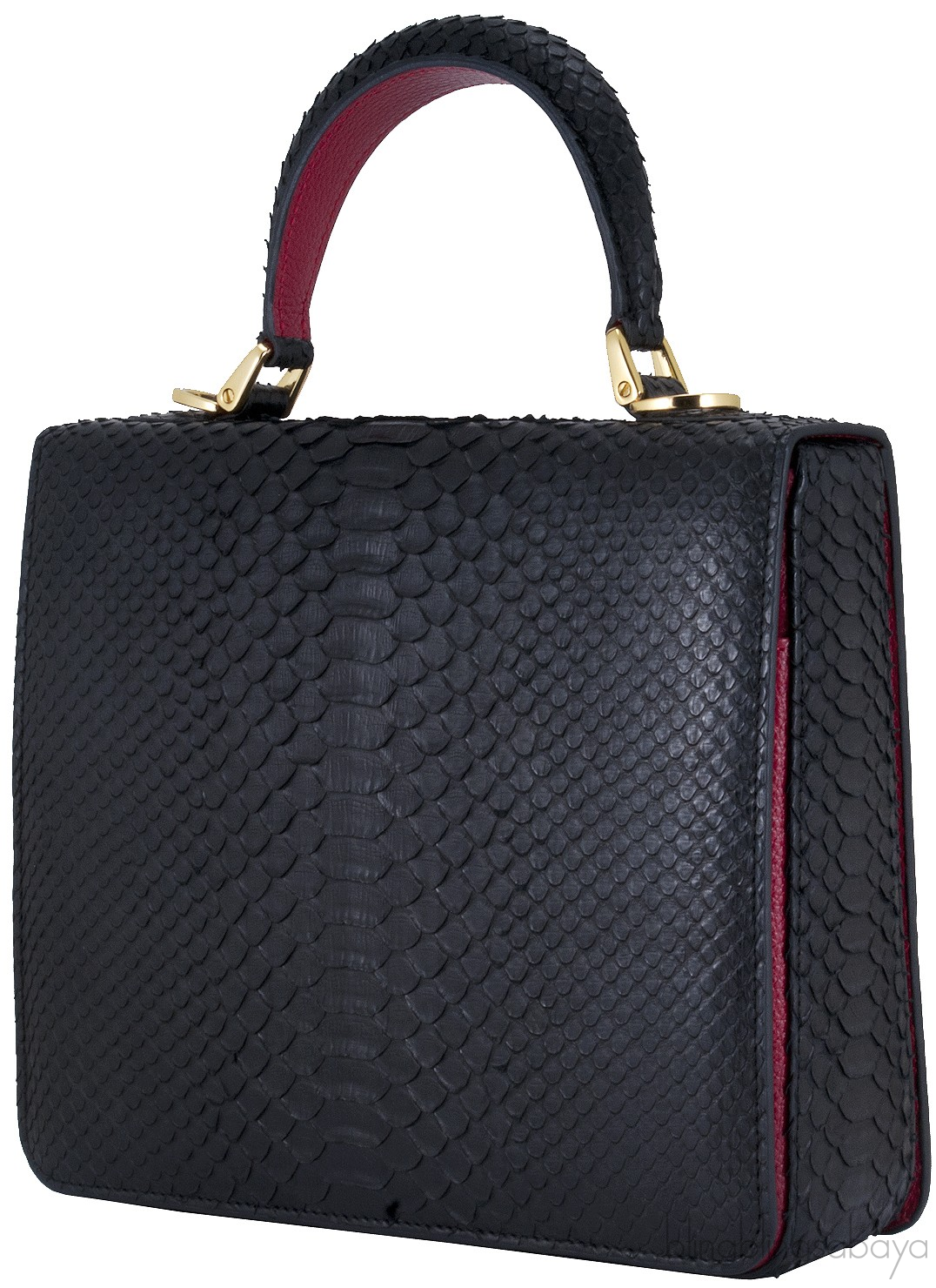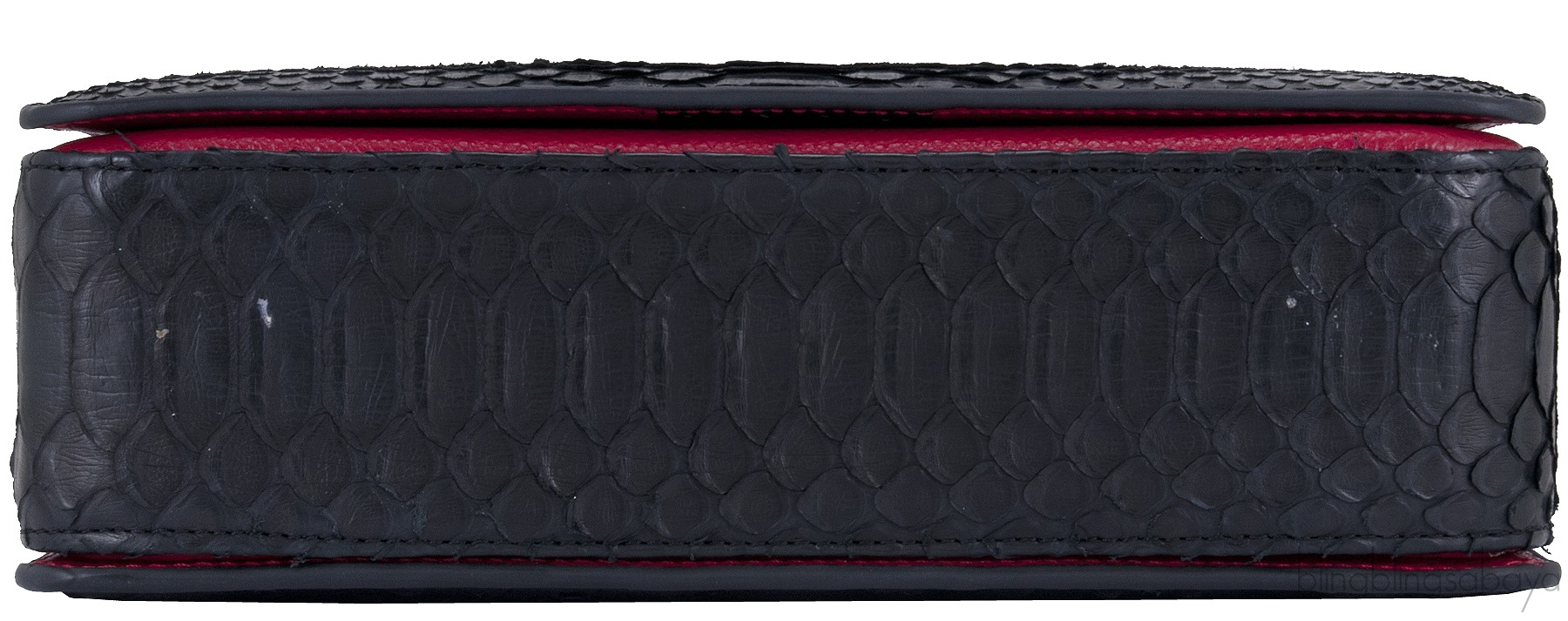 This elegant sophisticated Square F Bi-color Python Bag from S'uvimol is crafted in exotic black python leather with red leather lining. This purse features a structture design with single leather handle and has detachable flat shoulder strap. It has a magnetic flap cover that opens to reveal a red leather interior featuring two wall pockets and a main compartment.