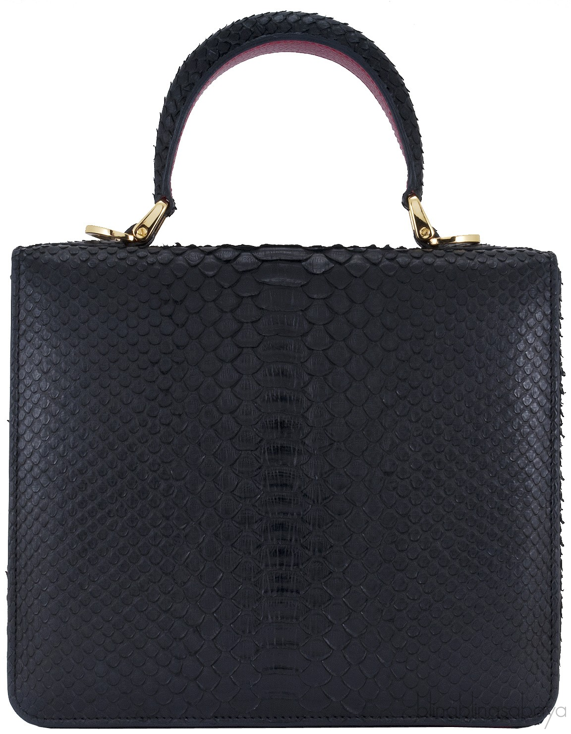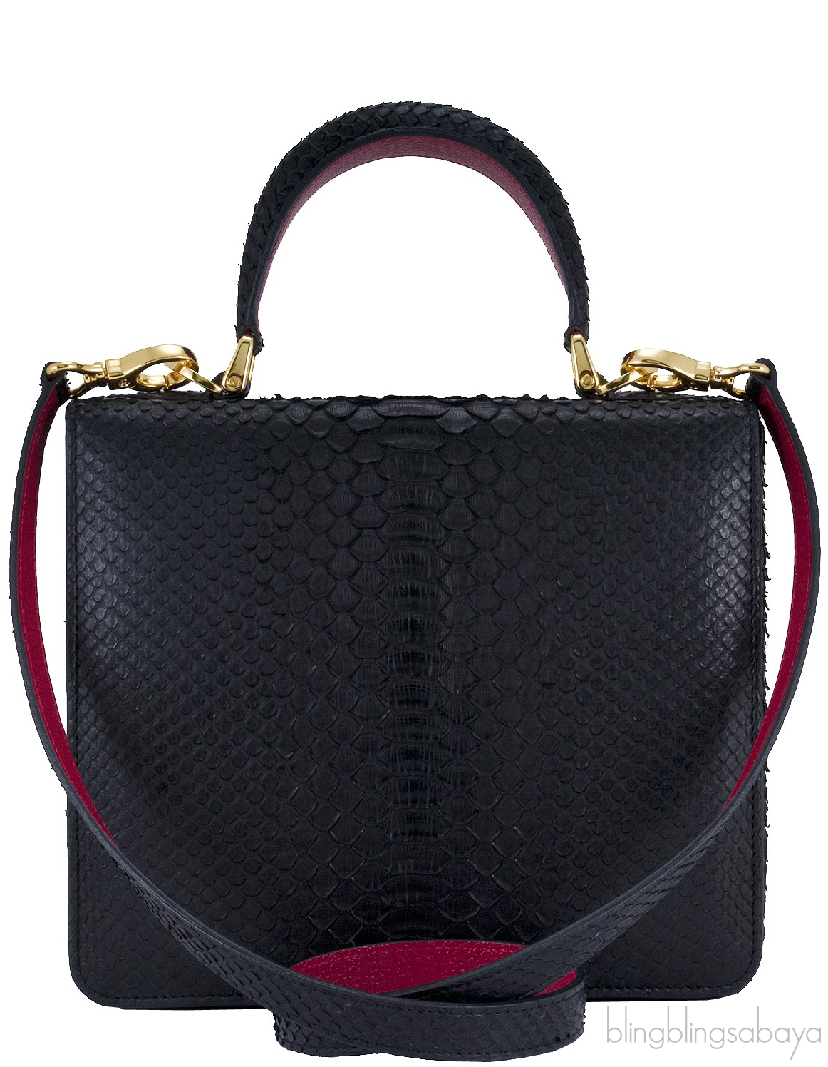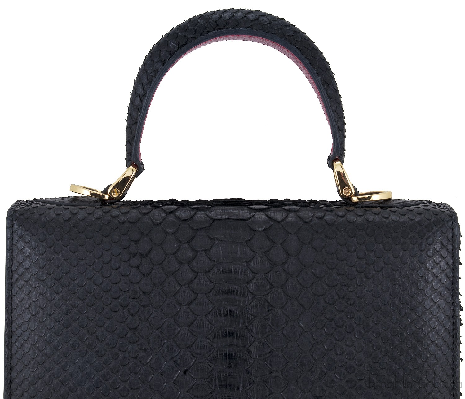 This elegant sophisticated Square F Bi-color Python Bag from S'uvimol is crafted in exotic black python leather with red leather lining. This purse features a structture design with single leather handle and has detachable flat shoulder strap. It has a magnetic flap cover that opens to reveal a red leather interior featuring two wall pockets and a main compartment.