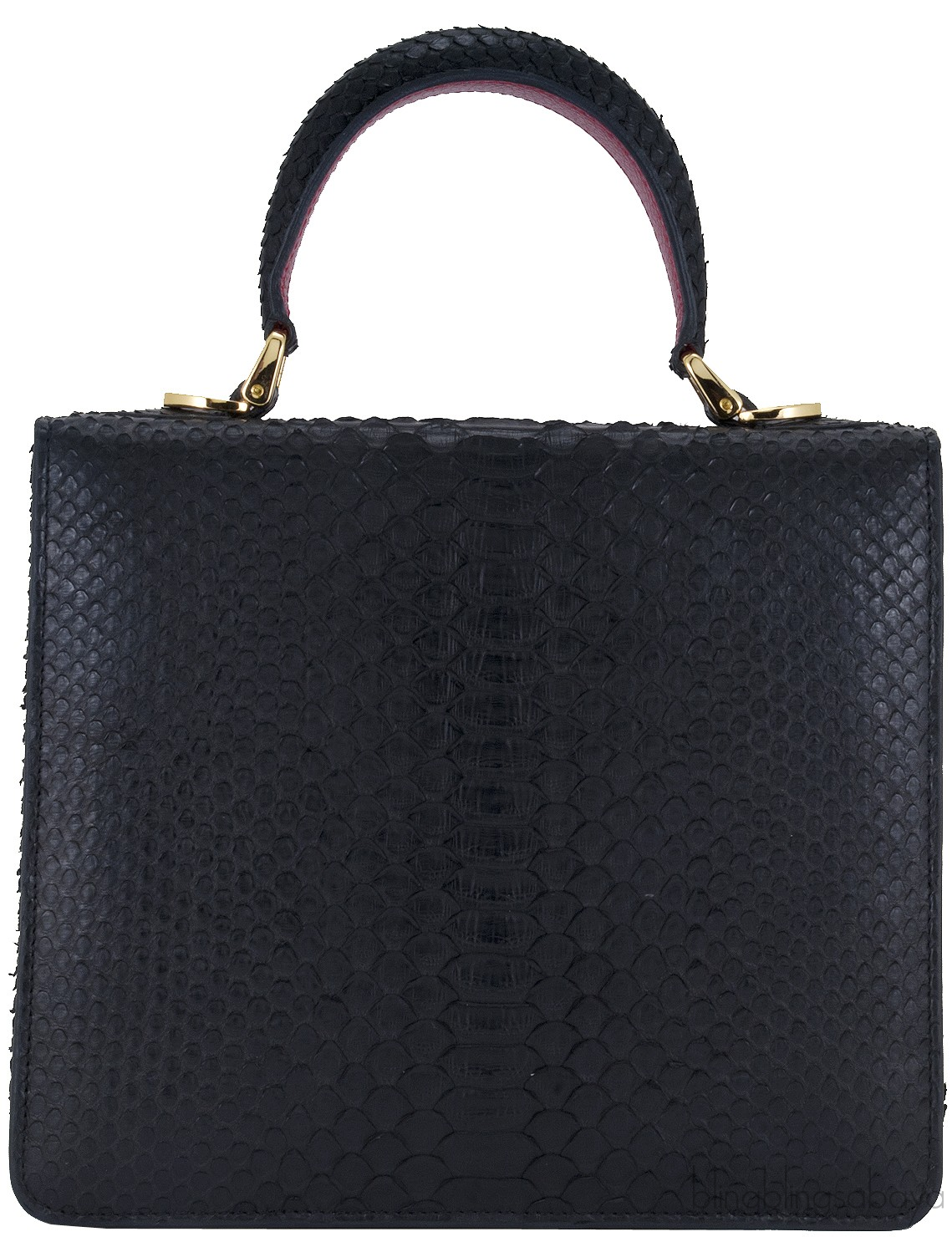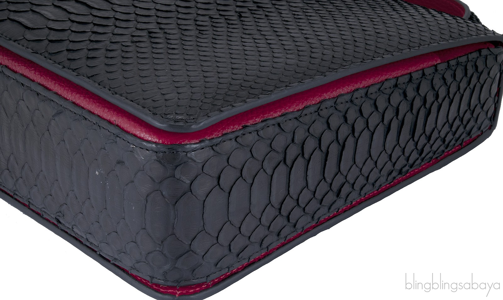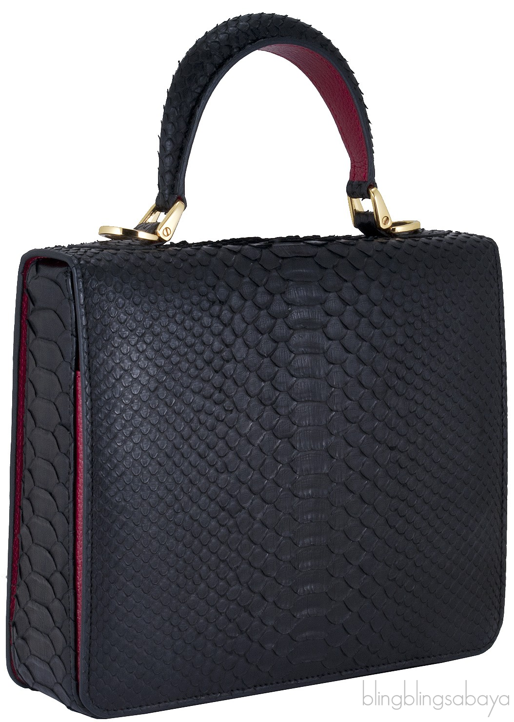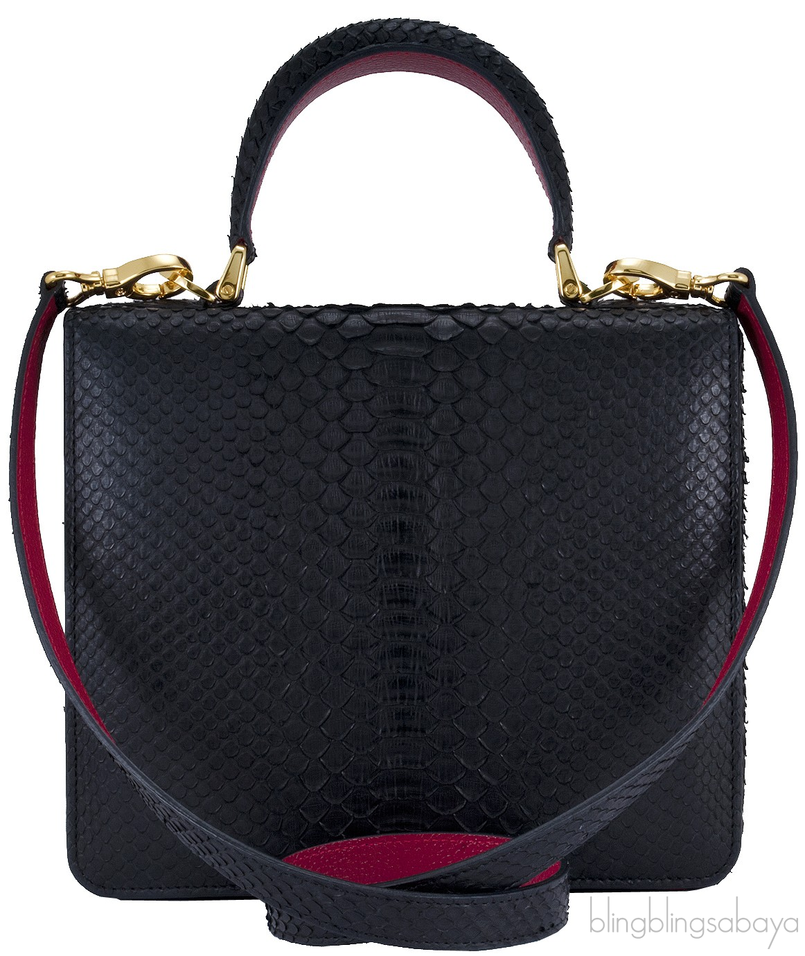 This elegant sophisticated Square F Bi-color Python Bag from S'uvimol is crafted in exotic black python leather with red leather lining. This purse features a structture design with single leather handle and has detachable flat shoulder strap. It has a magnetic flap cover that opens to reveal a red leather interior featuring two wall pockets and a main compartment.