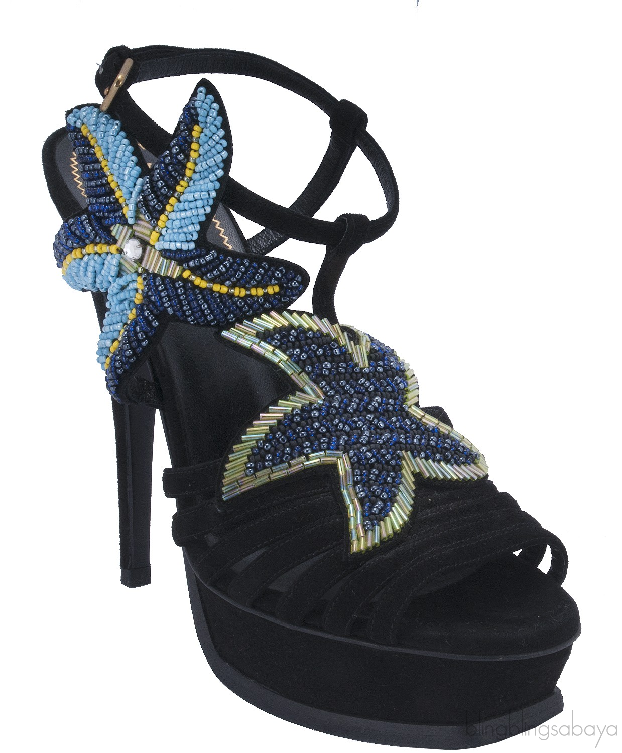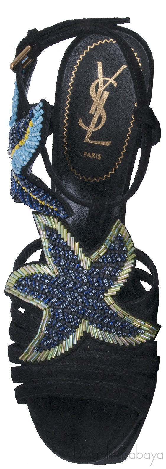 This Star Fish Suede Black High Heels from Yves Saint Laurent is crafted in black suede leather upper with leather lining. This features multiple front straps, a beaded starfish at the front and the side, a buckled ankle strap, a platform sole and a high stiletto heel.