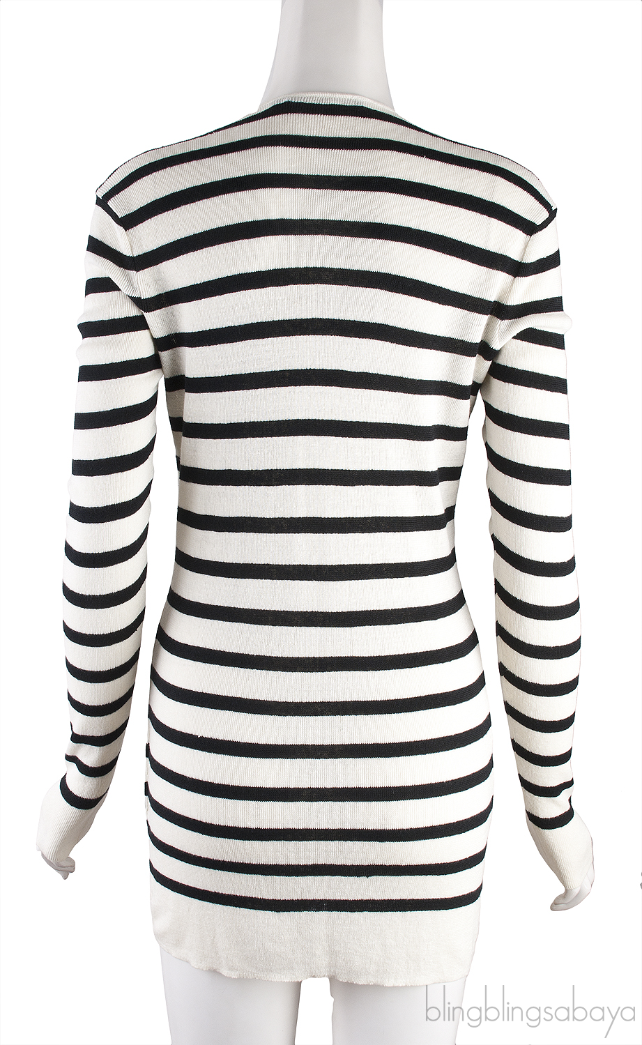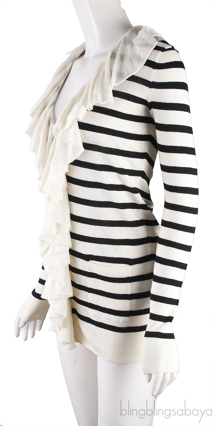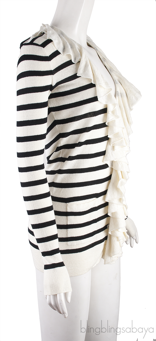 This Stripe Ruffled Cardigan from Ralph Lautton fastening to the front, white ruffled trim auren is crafted from 100%v Linen in off-white with black horizontal stripes. This Cardigan features a knitted fabric with long sleeves, button fastening to the front with ruffle trim and has two pockets near the hemline.