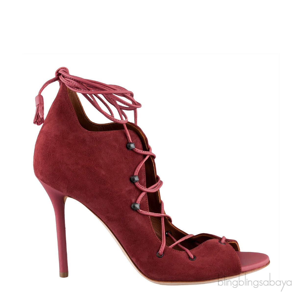 These Suede Lace Up Heels from Malone Souliers are crafted in dark old rose suede upper with brown leather lining.These sandals features a lace-up front. peep almond toe, leather lined insole, stiletto heels measuring 100 mm high, and leather sole