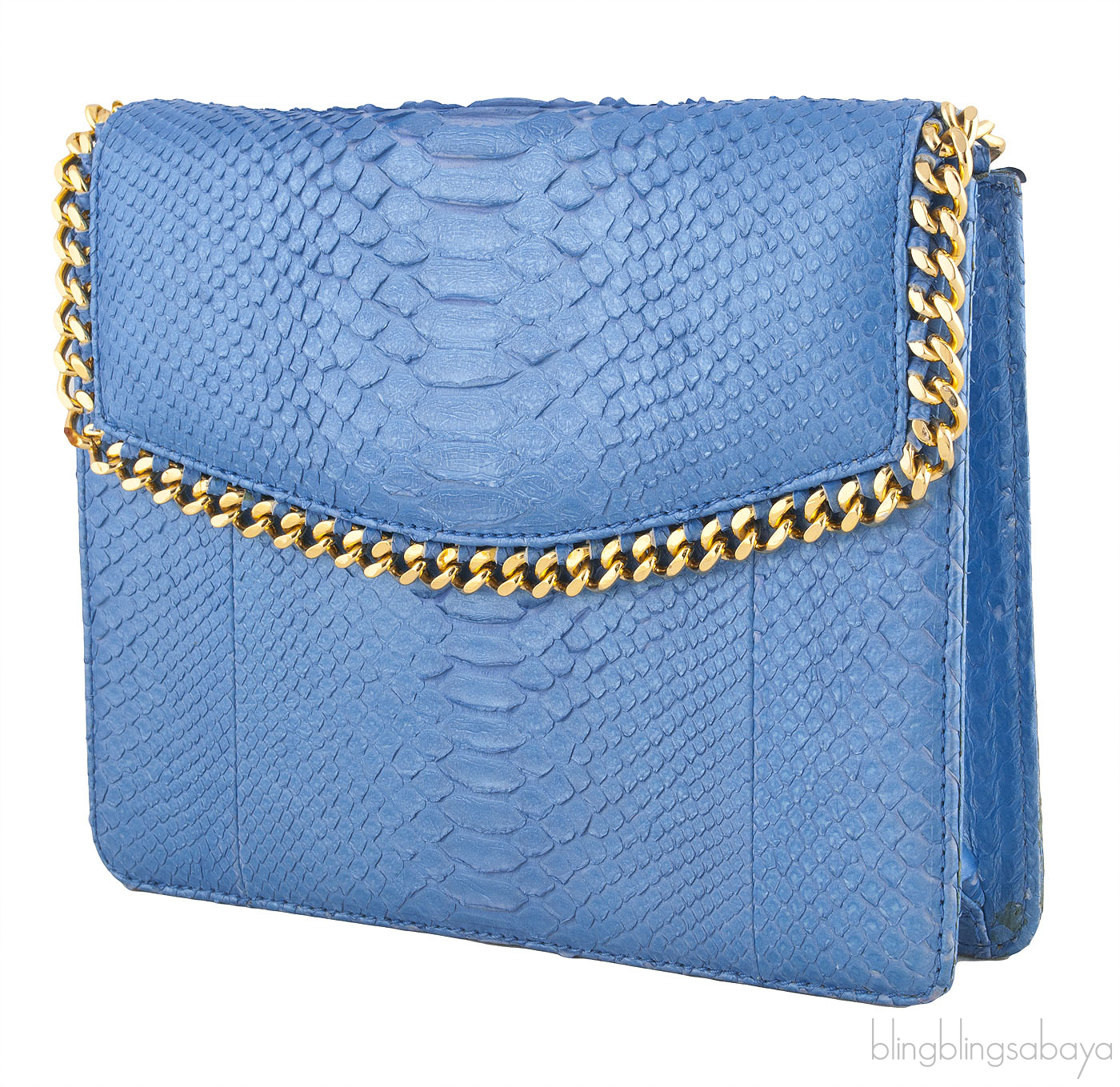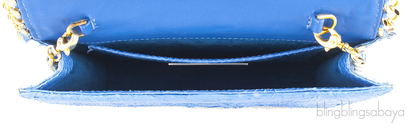 A glamorous piece that will mesmerize the people around you. This Cashhimi metallic blue python Shoulder clutch is a fabulous bag that features a clutch bag trimmed with golden chain inspired design in a python leather on the outside and suede leather on the interior.