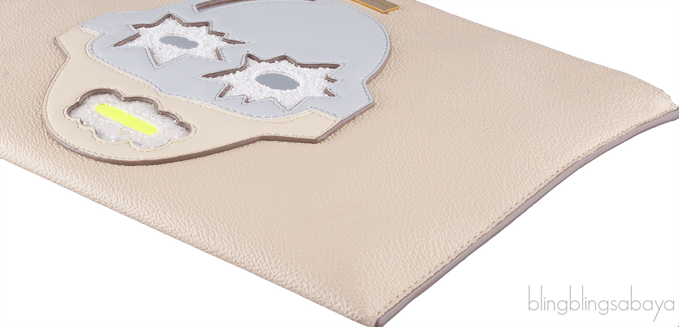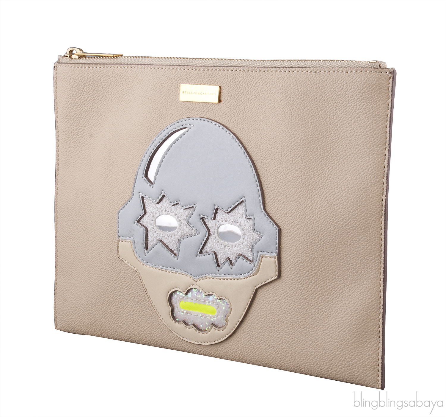 This Beige Superstellaheroes Purse from Stella McCartney is crafted in beige faux leather accented with the gold hardware. This clutch features a superhero face applique at front complete with a matte light blue and silver faux patent-leather hat, white glitter-coated eyes and mouth. This clutch has a secure zip fastening along top and interior is fully lined with faux suede with one patch pocket inside.