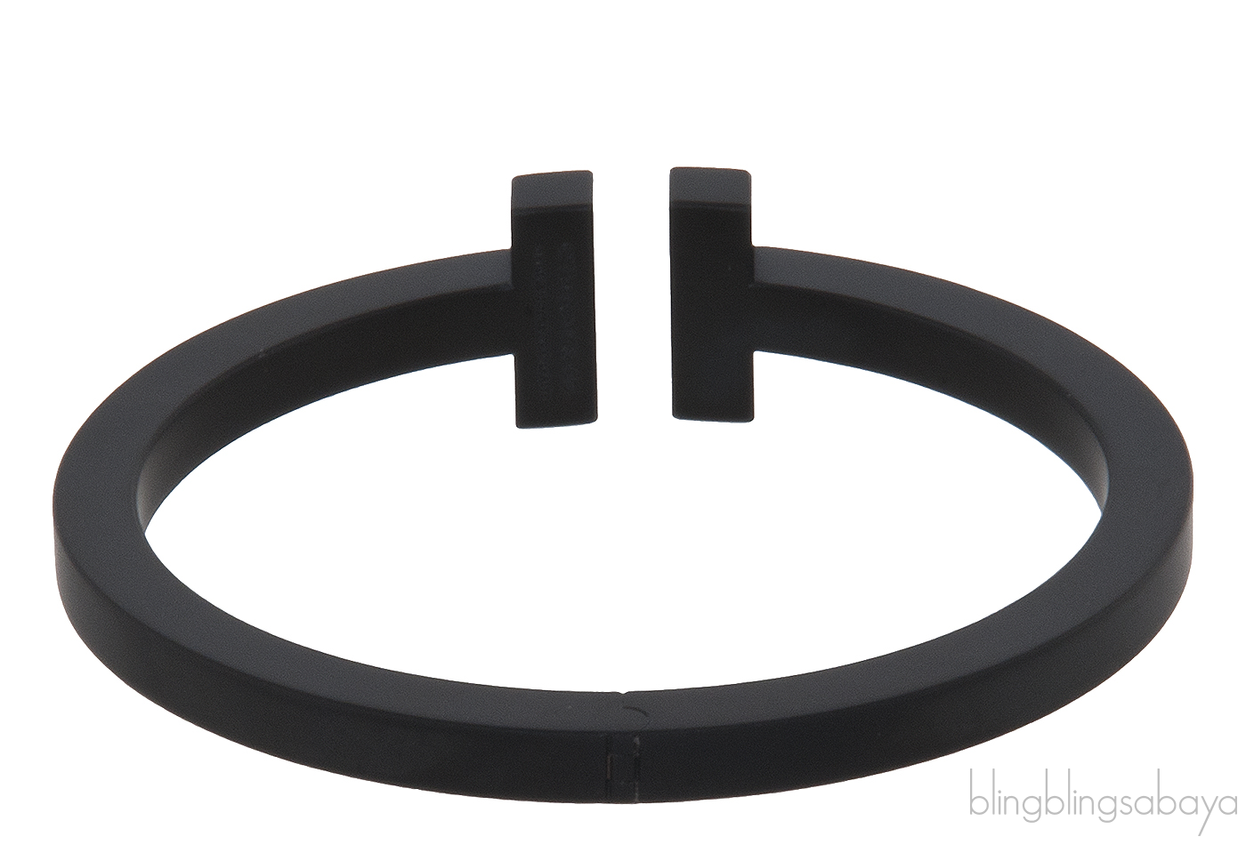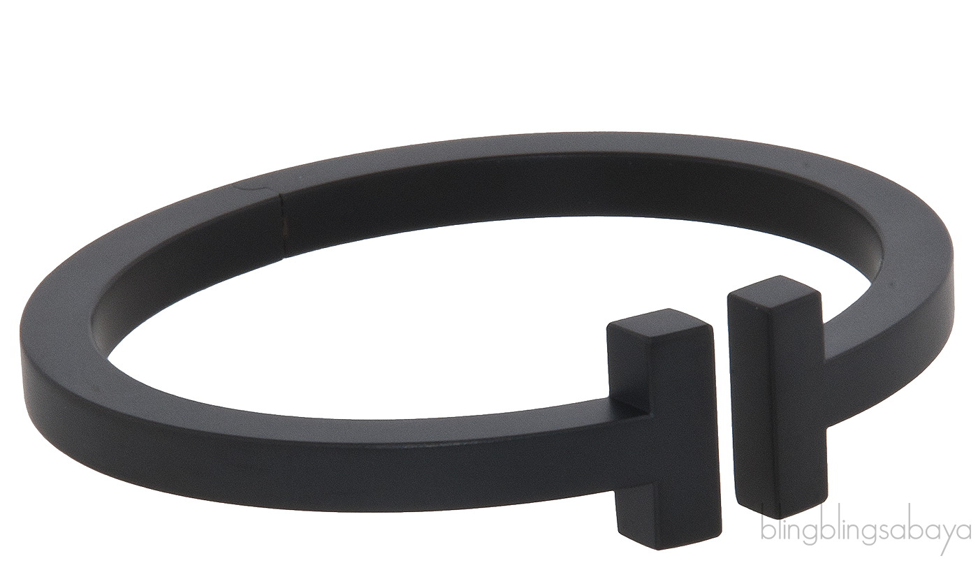 This T Square Coated Steel Bracelet from Tiffany & CO, Graphic angles and clean lines blend to create the beautiful claritys of the Tiffany T collectsion. This bold bracelet exudes a sleek sophistication. Masterfully crafted from black coated steel, this linear bracelet flexes around the wrist and has an open band. 16cm Diameter, Size width circumference width of opening