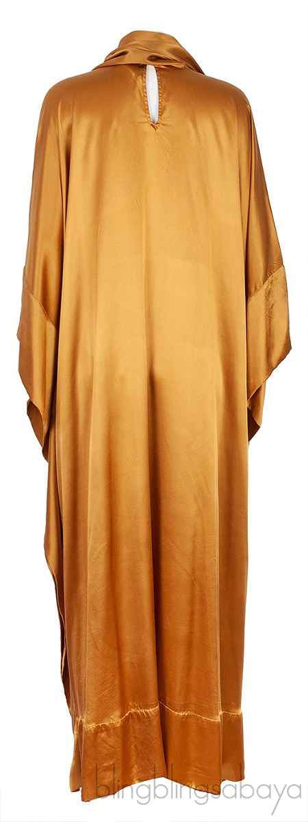 This New Age Silk Kaftan Gown from Taller Marmo is crafted from 100% Silk fabric in gold. This oversize kaftan dress features a kaftan sleeves, keyhole opening at the back, collar neck self-tie and maxi length. Pull-over!