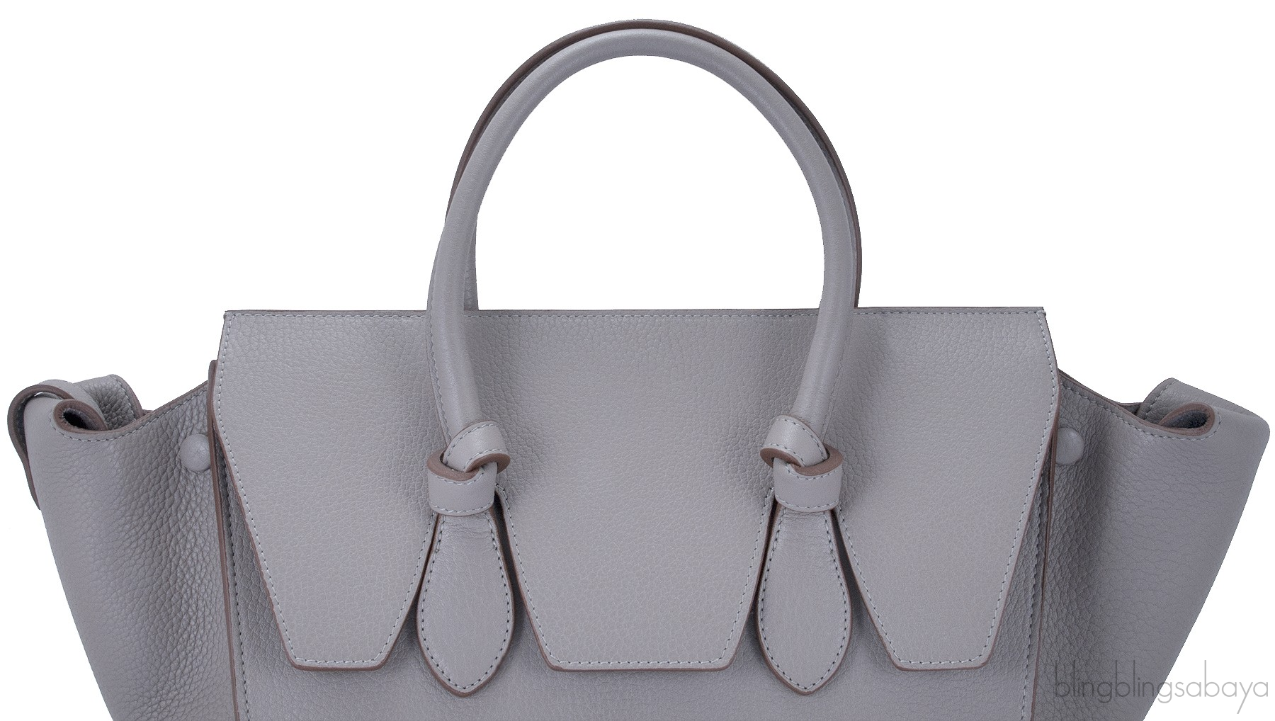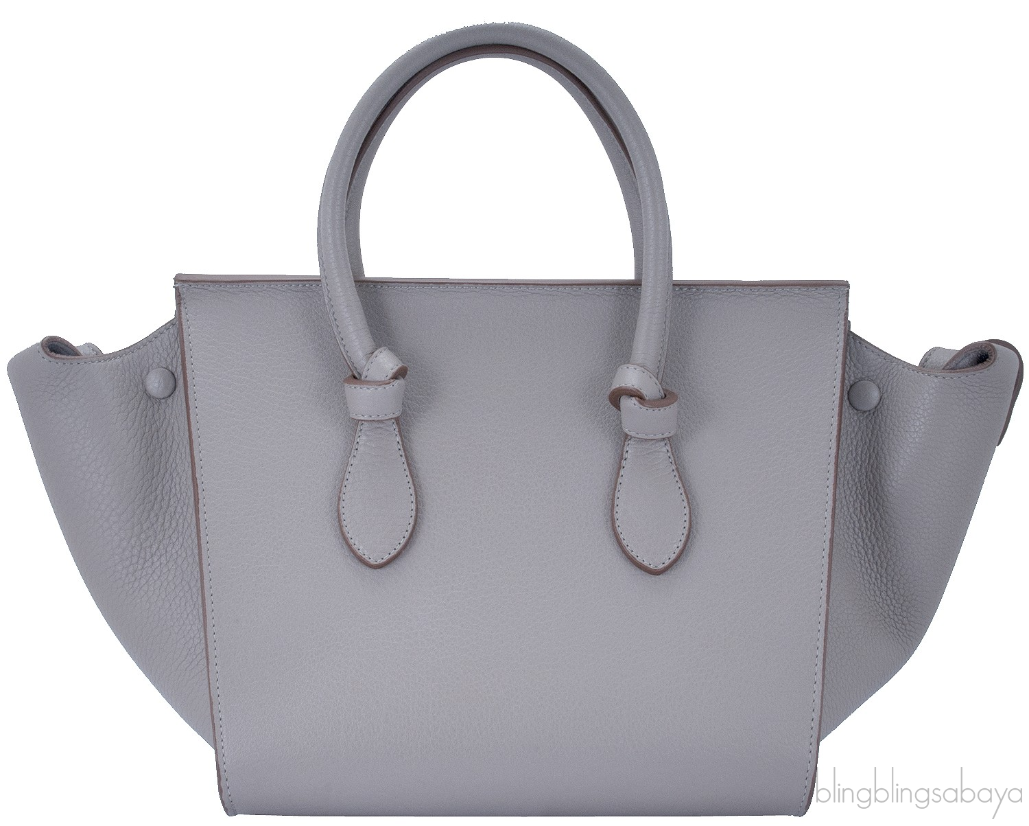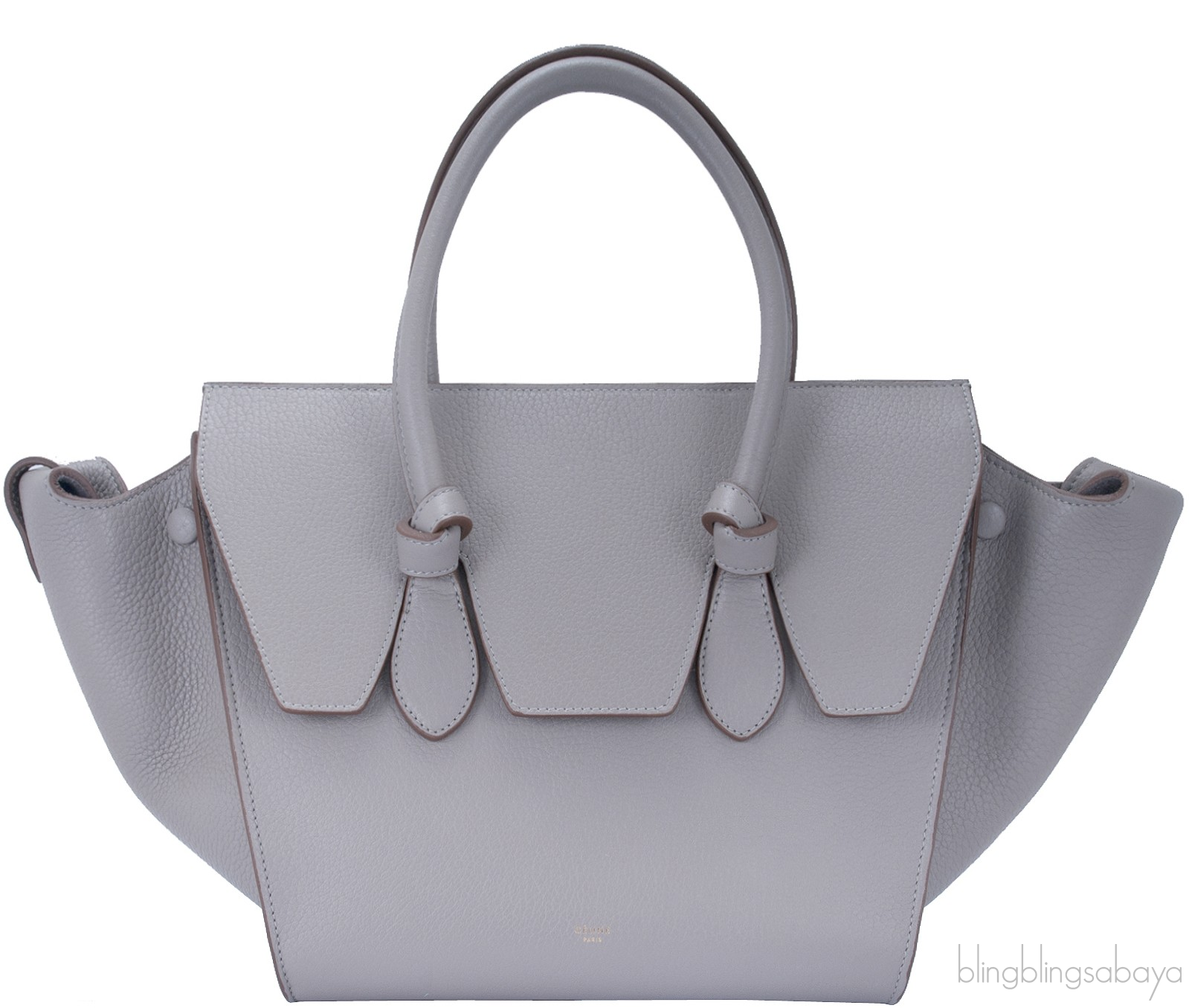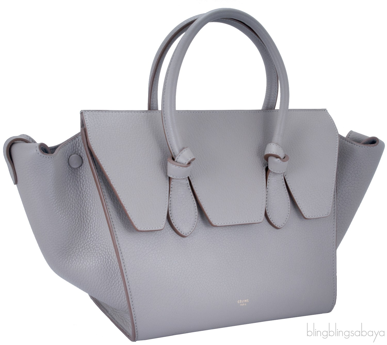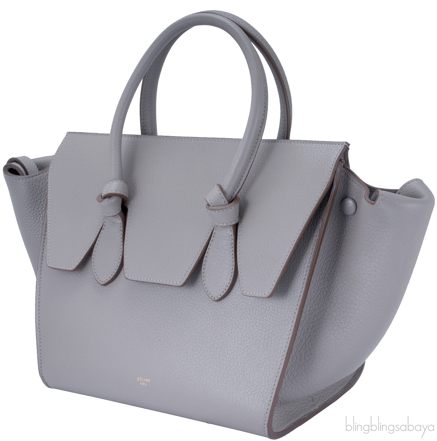 This Taupe Leather Tie Tote Bag from Celine is crafted in Taupe textured leather accented with the golden hardware. This tote features a structured design with wings, front flap cover and knot detailing on two comfortable rolled leather handles.This piece has very roomy interior to carry your treasure belongings. Fully lined with suede leather and has two open compartment inside.