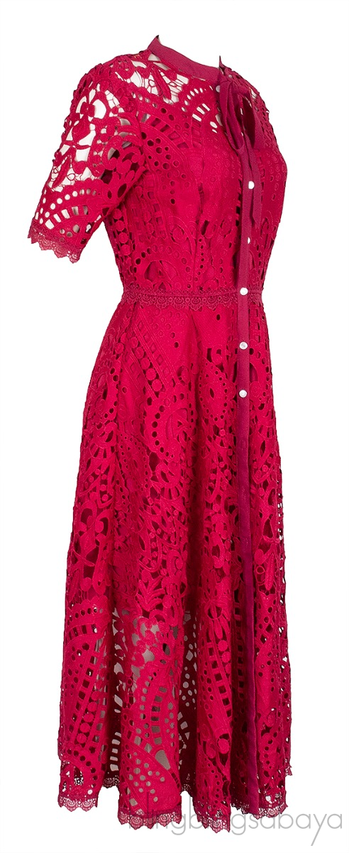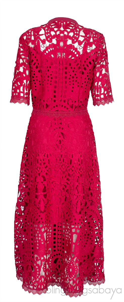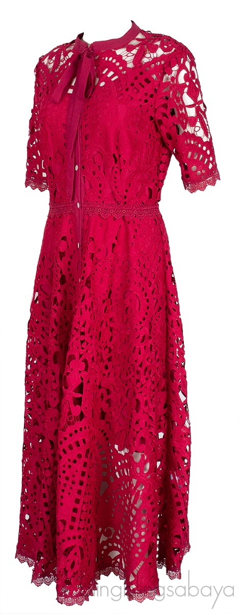 This Fuchsia Laser Cut Dress from Temperley London is crafted in 100% Polyester in fuchsia pink hue. This dress features a laser cut design all-over, button fastening at front, short sleeves with scallop trim, close neckline with tie fastening, mid-length with scallop hemline and comes with inner dress lining.