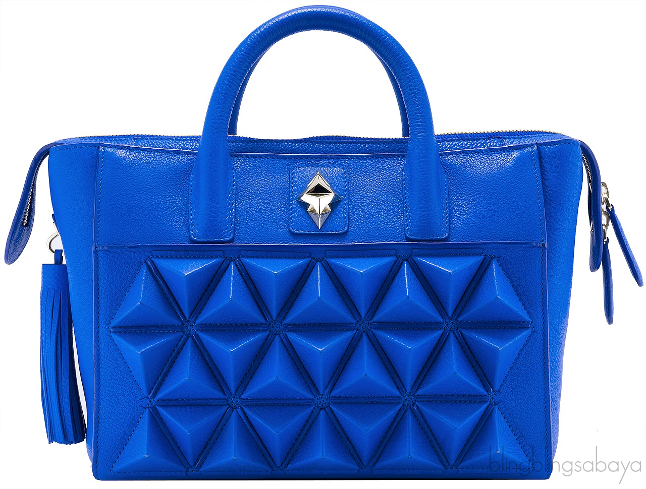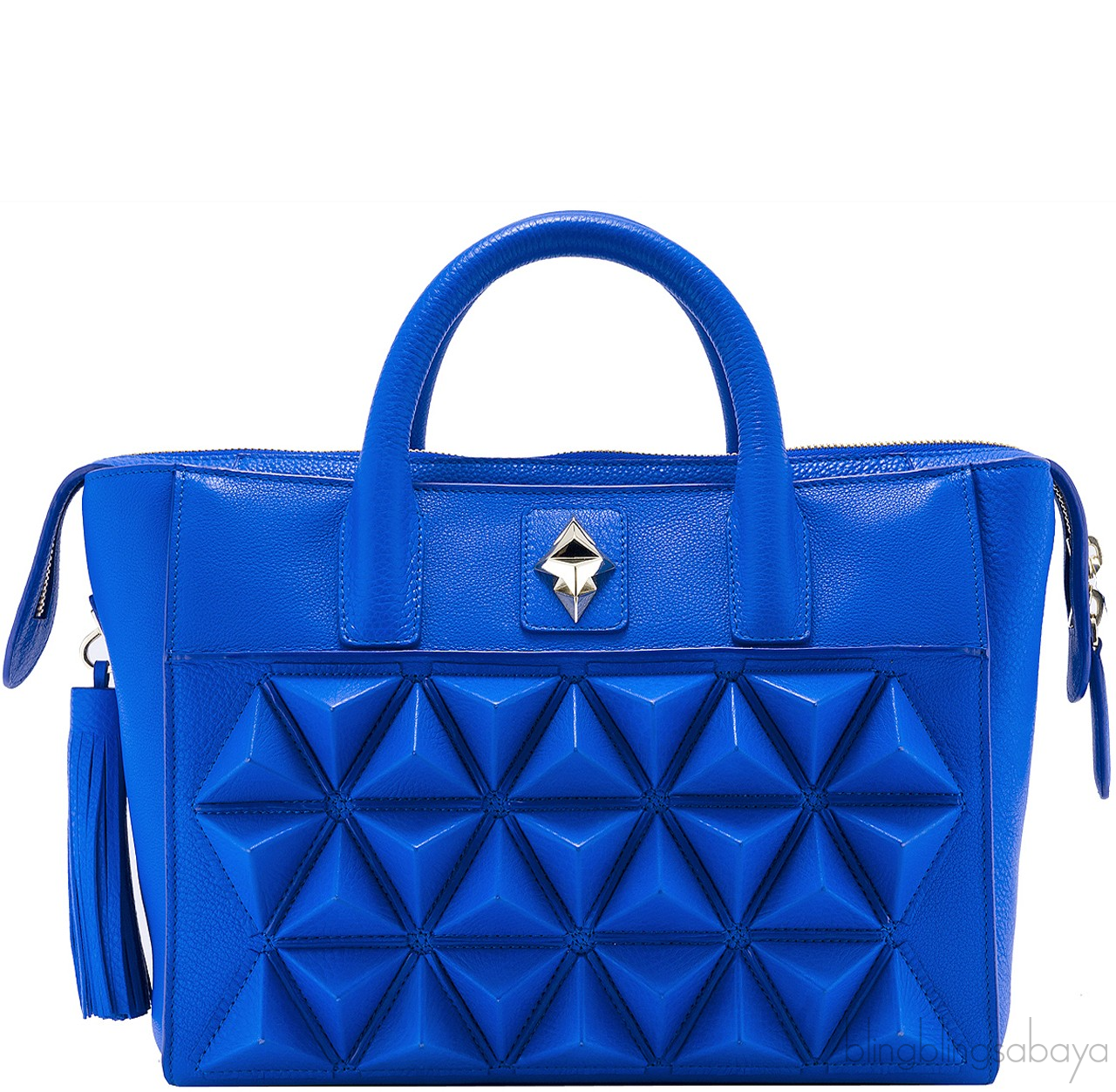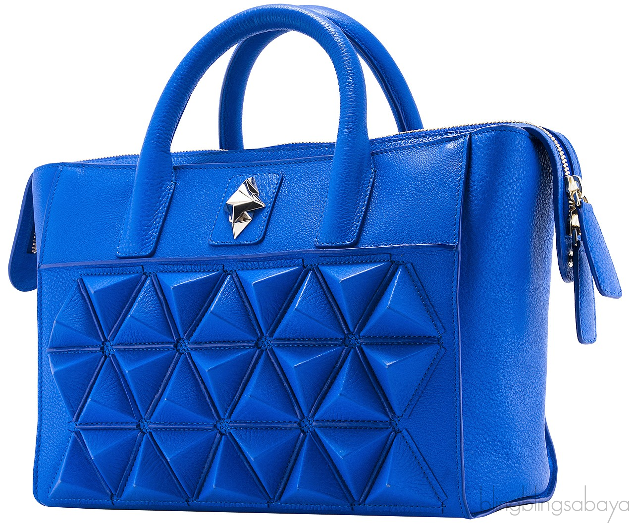 Known for its geometric sleek design, this bag features a funky pyramid design on the front with a golden metal logo2. It comes in two rolled leather handle and a dangling leather on the side. It has the top zip opening and interior is lined with coordinating blue lambskin leather with several compartment inside.