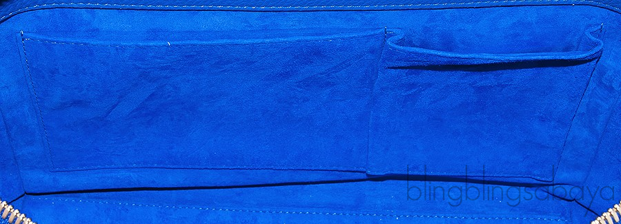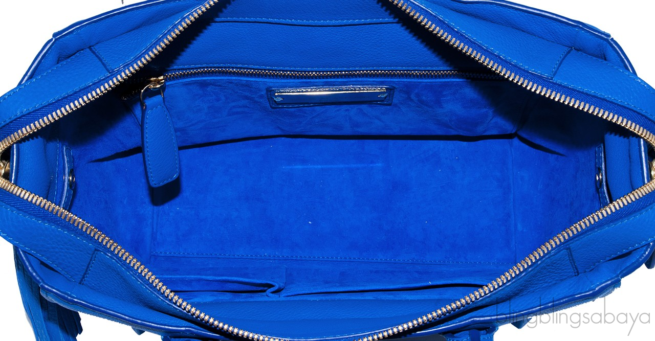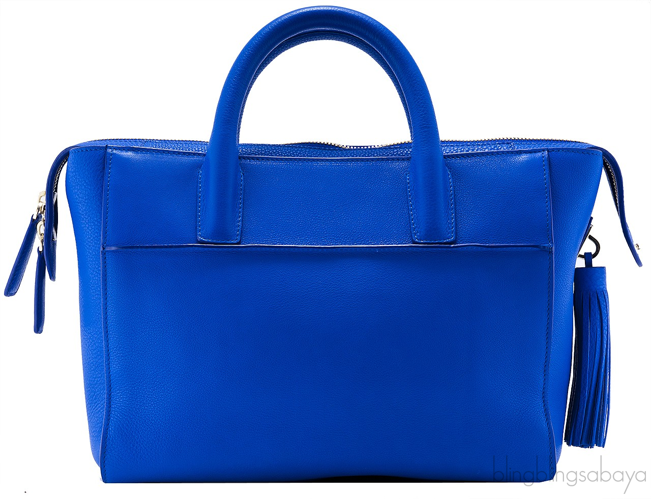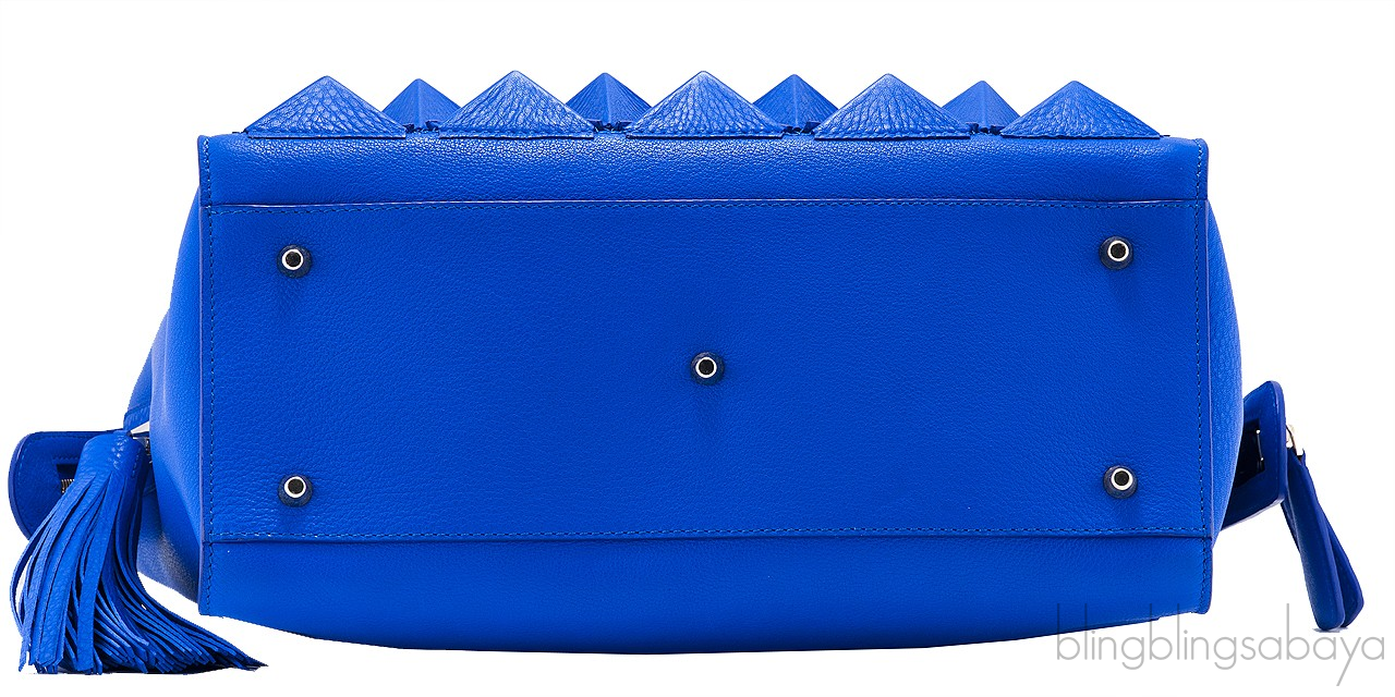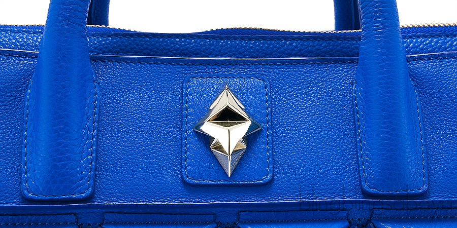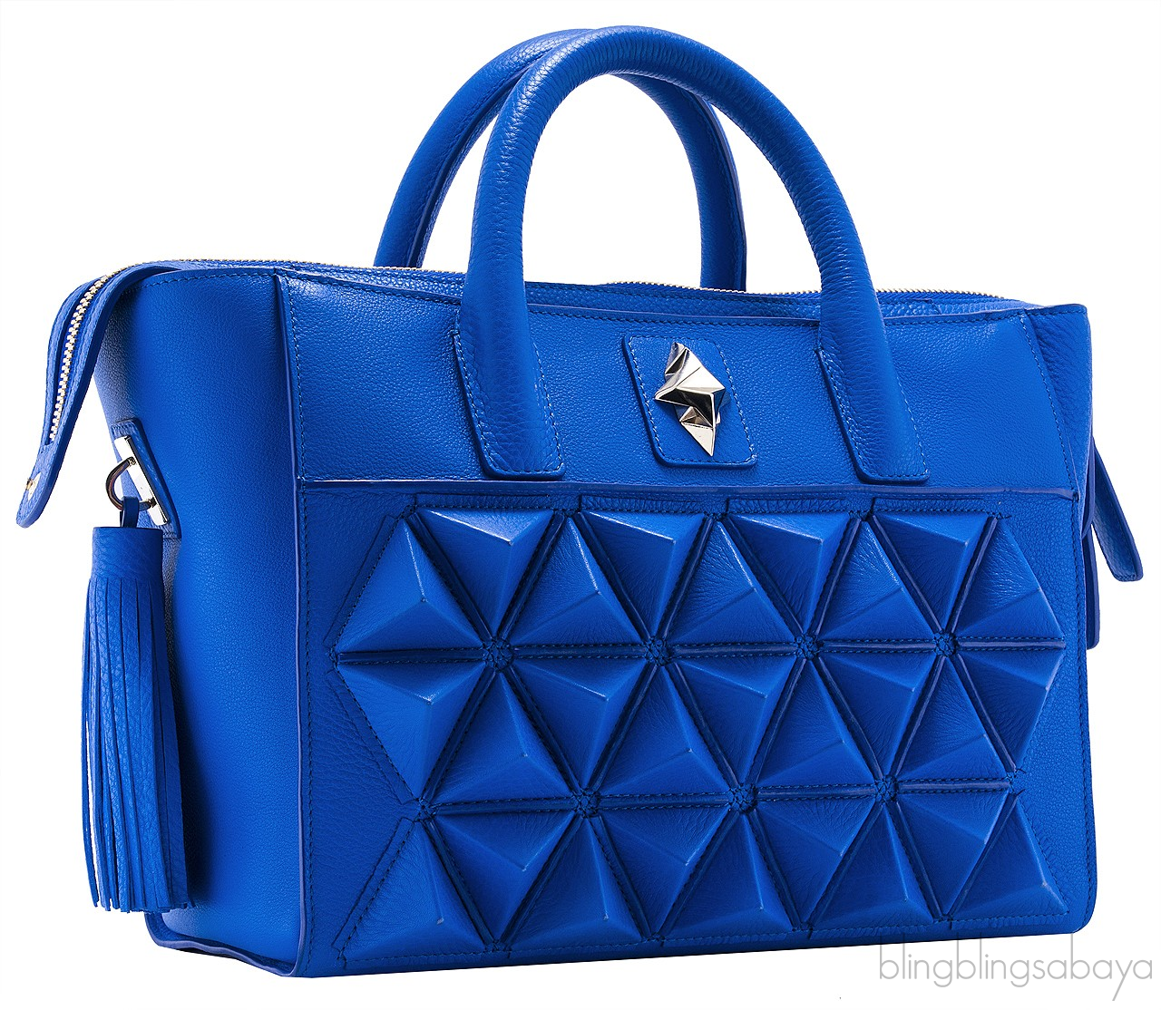 Known for its geometric sleek design, this bag features a funky pyramid design on the front with a golden metal logo2. It comes in two rolled leather handle and a dangling leather on the side. It has the top zip opening and interior is lined with coordinating blue lambskin leather with several compartment inside.