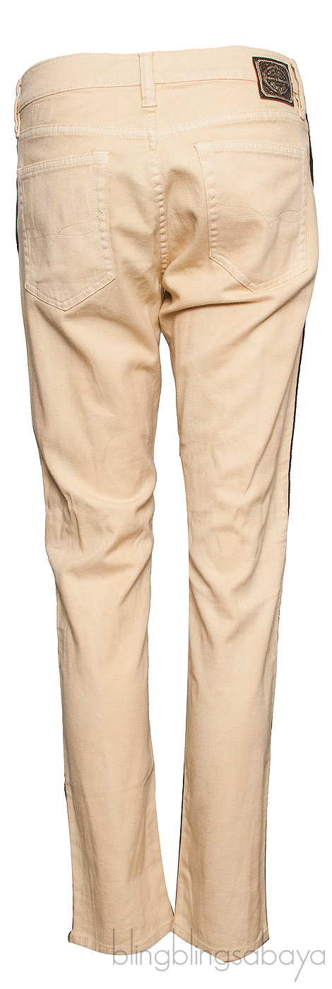 This Thompson Skinny Jeans form Ralph Lauren is crafted from 76% Cotton. 22% Linen and 2 Elastane in beige hue featuring soft comfy fabric with five classic pockets. zip and hook fastening, self-belt at the waist with gunmetal hook, 3 pairs of metal eyelets for adjustment, and contrasting black striped detailing on both sides.