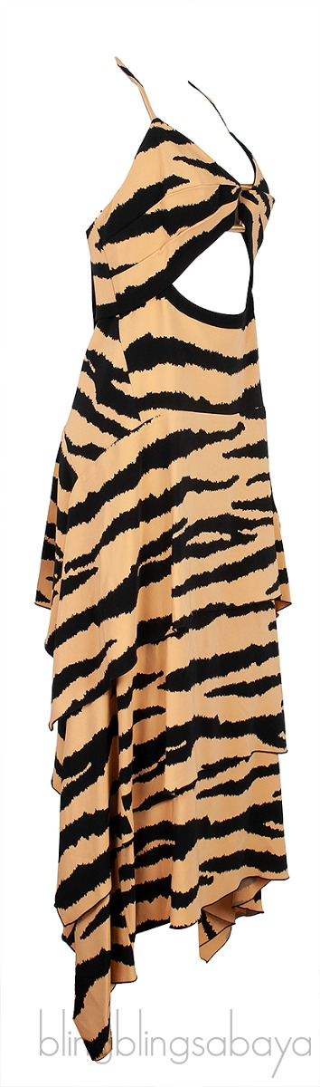 This Tiger Print Cami Dress from Proenza Schouler is crafted from 100% Viscose fabric in black and brown hue and tiger motif. This dress features a thin, long straps that tie at the shoulder. Cut-out detail below the bust and a tiered flowing skirt. Custom-developed trapezoidal hardware at the chest.