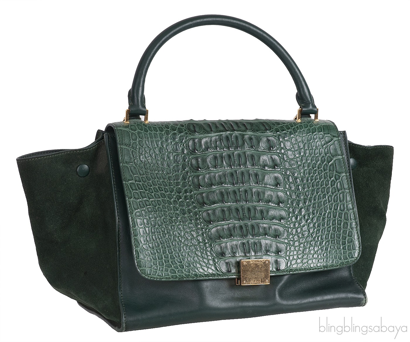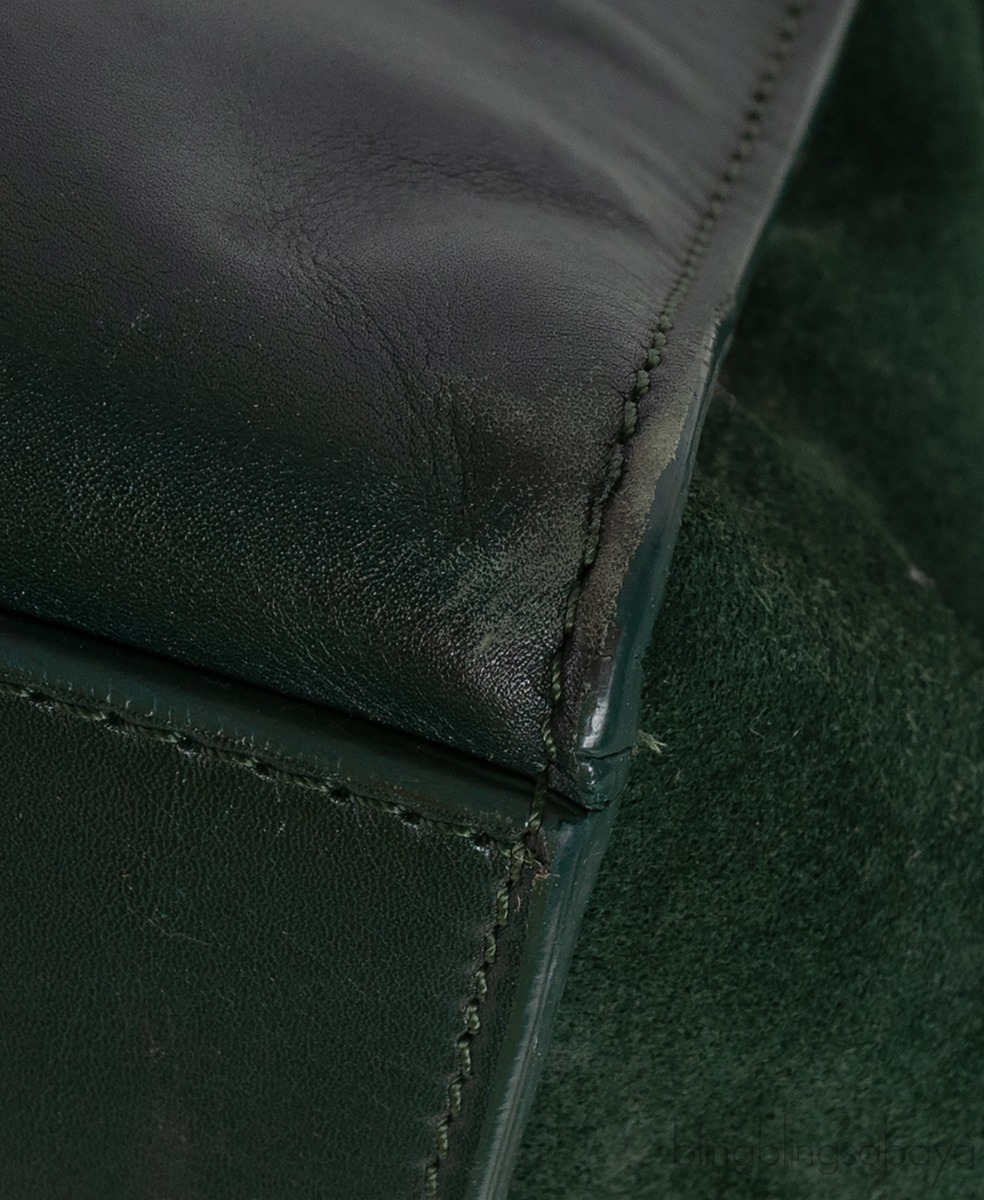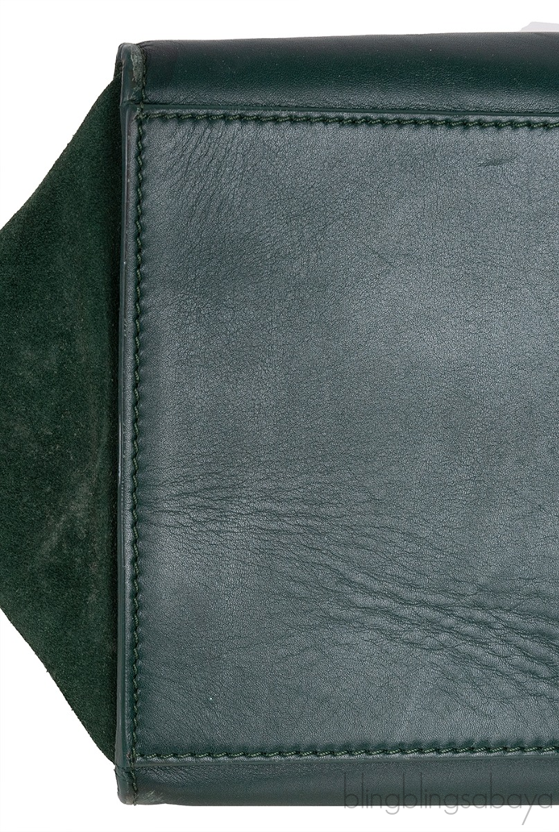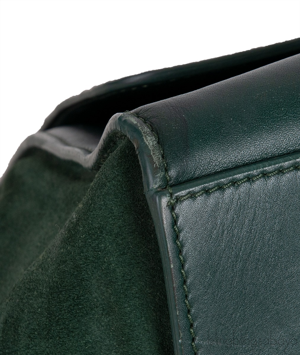 This stunning Shoulder Trapeze Medium Shoulder from Celine is made from emerald green leather and suede accented with the gold hardware. This bag features a croc embossed at the front flap with Suede Leather wings comes with single top rolled leather handle