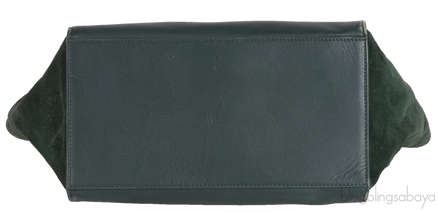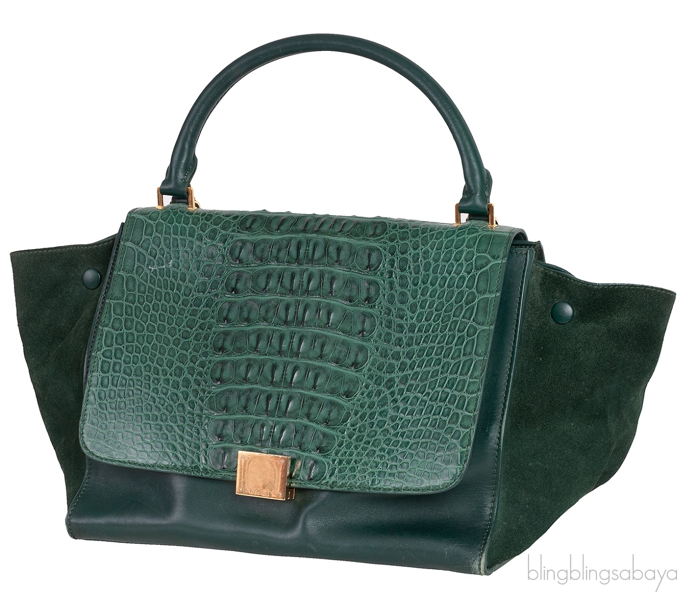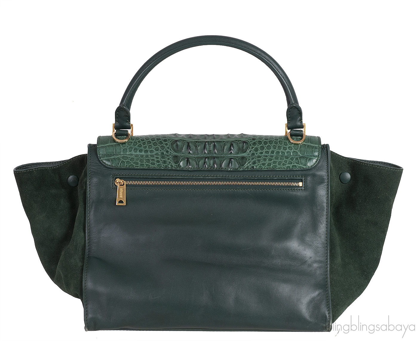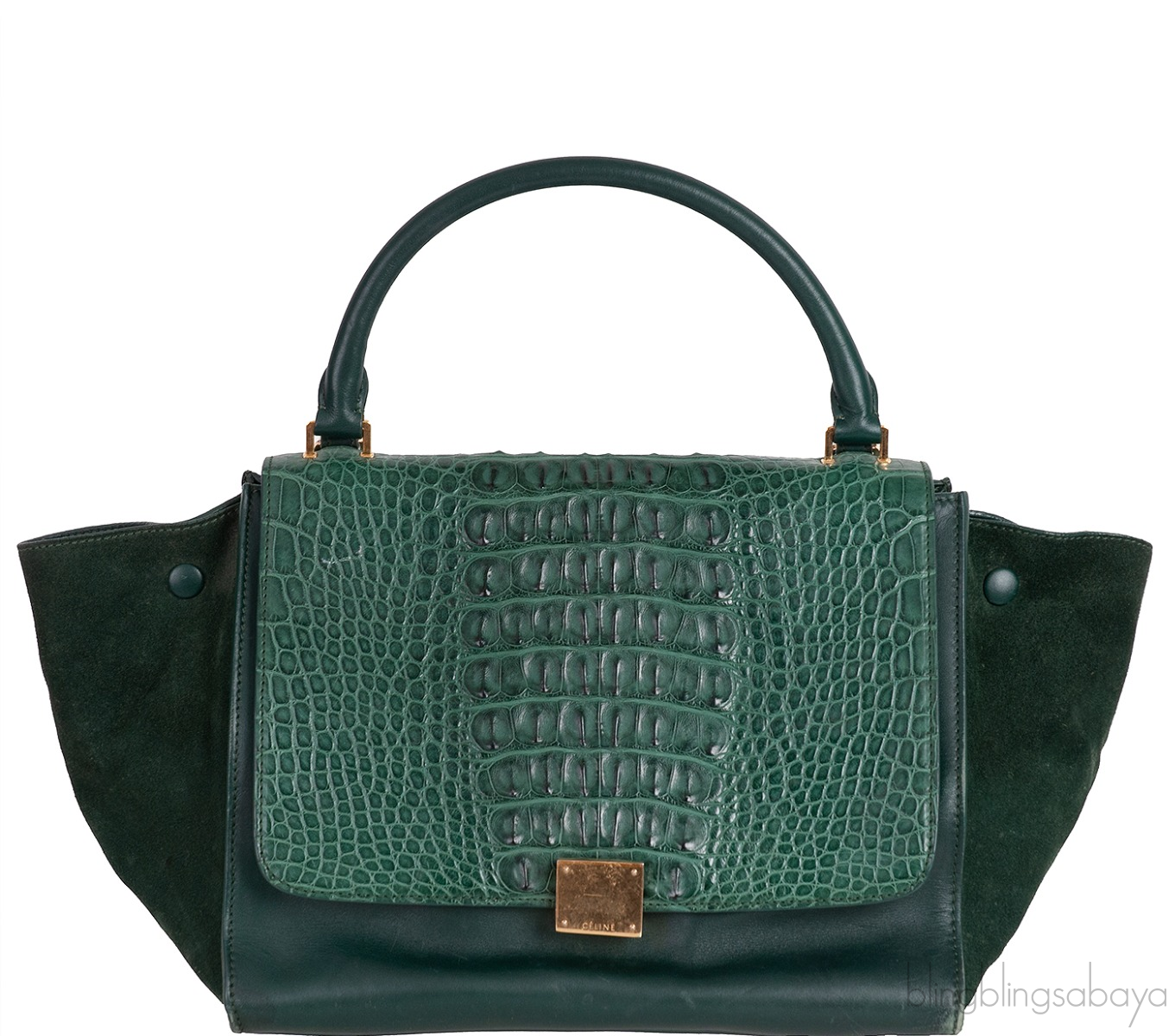 This stunning Shoulder Trapeze Medium Shoulder from Celine is made from emerald green leather and suede accented with the gold hardware. This bag features a croc embossed at the front flap with Suede Leather wings comes with single top rolled leather handle